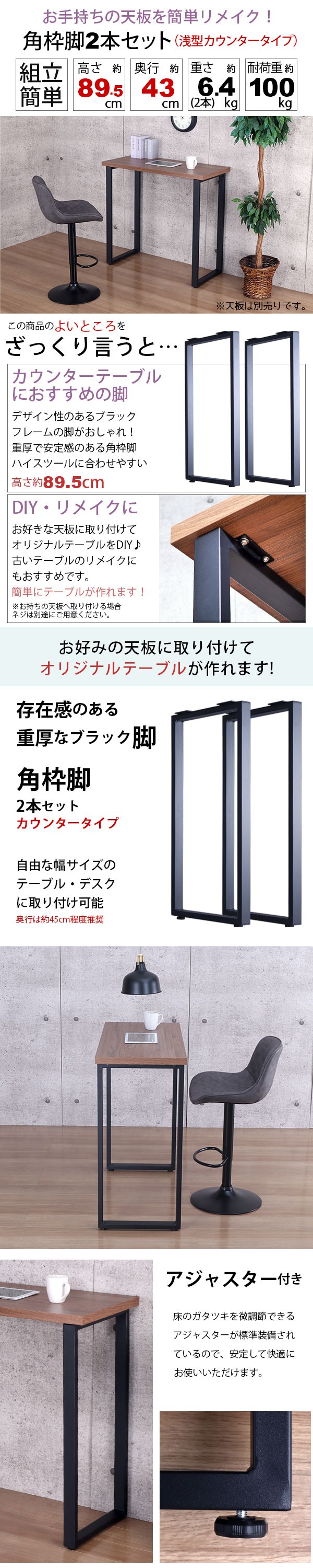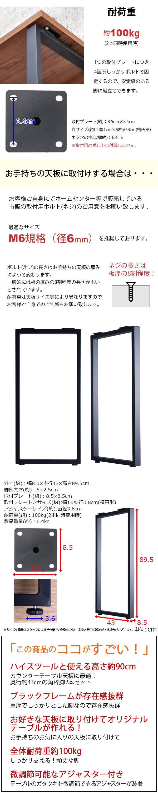 浅型カウンター用角枠脚2本セット 高さ約90cm 奥行約43cm アジャスター付(※天板別売り) の説明