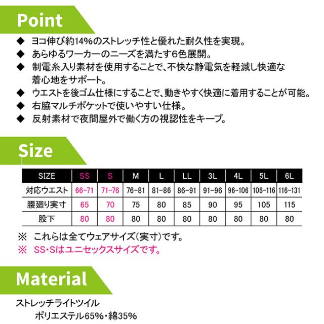 ◇機能:ストレッチT/C素材・マルチカラー展開・帯電防止素材・ウエストバックシャーリング・便利なパンツポケット・反射・接触冷感