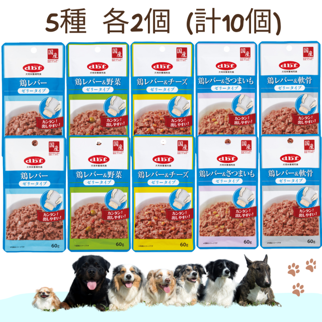 デビフ ゼリー 60g 5種セット 各2個 計10個 鶏レバー 鶏レバー野菜 鶏レバーチーズ 鶏レバーさつまいも 鶏レバー軟骨 dbf 犬用 ドッグフード ペットフード ご飯 おやつ 犬 安心 安全 日本製 国産 わんちゃん 野菜 パウチタイプ パウチ