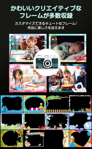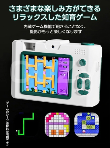 製品機能:イン/アウト二つのカメラ、動画再生、MP3再生、複数のフィルター、長時間使用可能、さまざまなフレーム、いくつかのミニゲーム