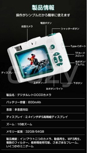 製品名:デジタルレトロCCDカメラ キッズカメラ デジタルカメラ デジカメ 1080p動画 16倍ズーム 2.4インチIPSスクリーン ビデオ録画 ウェブカメラ 多機能カメラ 使いやすい 軽量 小型 子供の日 プレゼント 32gメモリカード