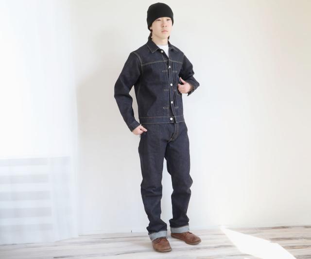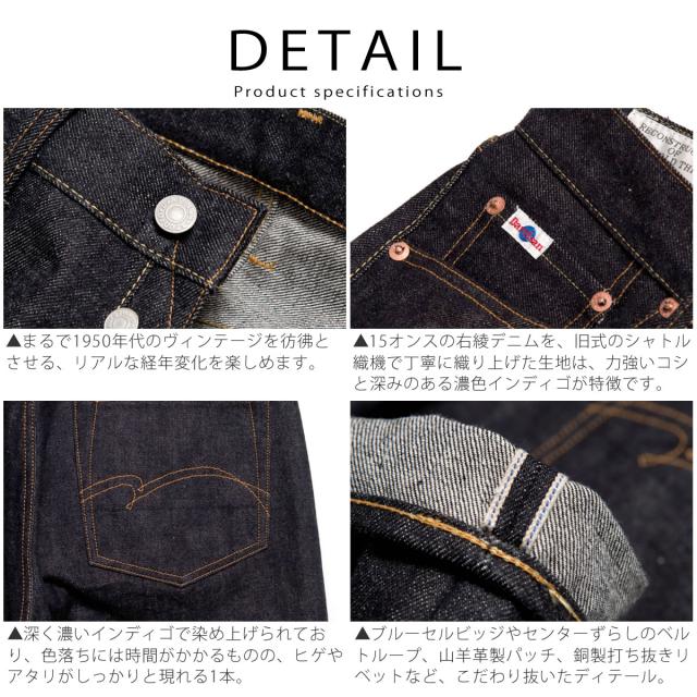 1950年代の風合いを再現するため、貴重な旧式シャトル織機で織り上げた15オンスの肉厚デニムを使用。
