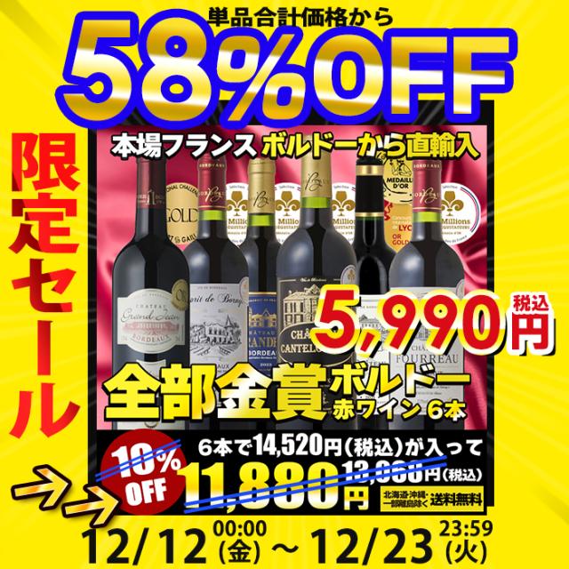 ワイン ワインセット 全て金賞受賞 ボルドー赤ワイン 6本セット 送料無料 一部除外 フランスワイン ボルドーワイン 赤ワイン 辛口 ワインセット 母の日 父の日 敬老の日 クリスマス バレンタイン ホワイトデー