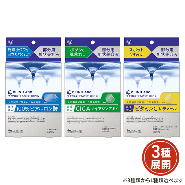 商品名 クリニラボ マイクロニードルパッチ 6枚入り メーカー 大正製薬 種類 ディープ-Hy、ディープ-Ci、ディープ-Vi 容量 6枚入り 成分 【ディープ-Hy 乾燥小ジワ※1】ヒアルロン酸Na