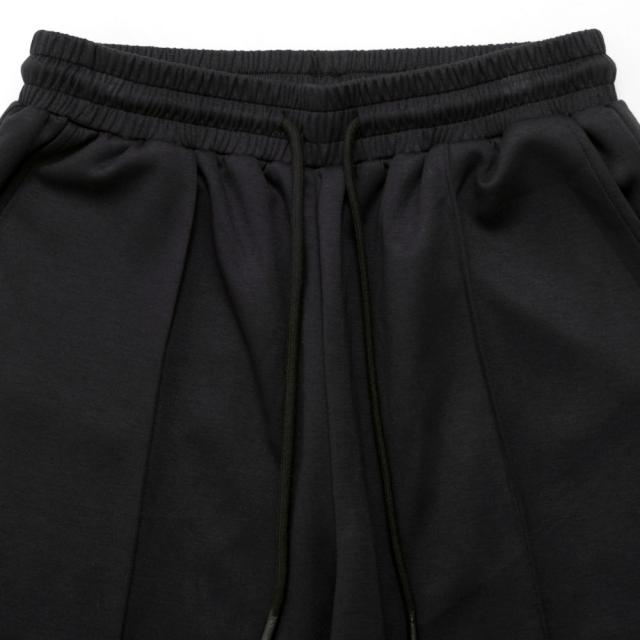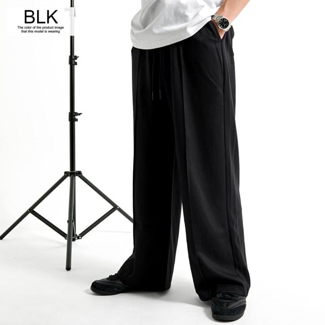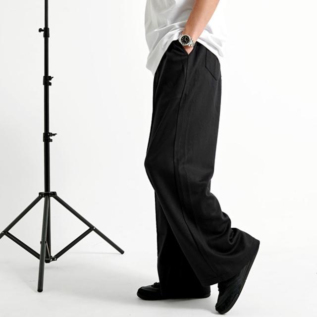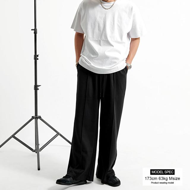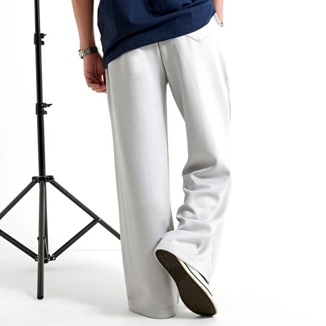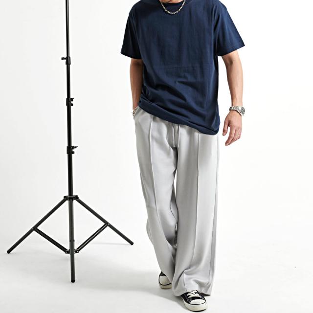 全体はリラックス感のあるワイドシルエットながら、中央に折り目をつけたセンタープレス仕様で、 野暮ったく見せず、すっきりとした印象を演出。