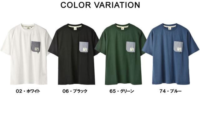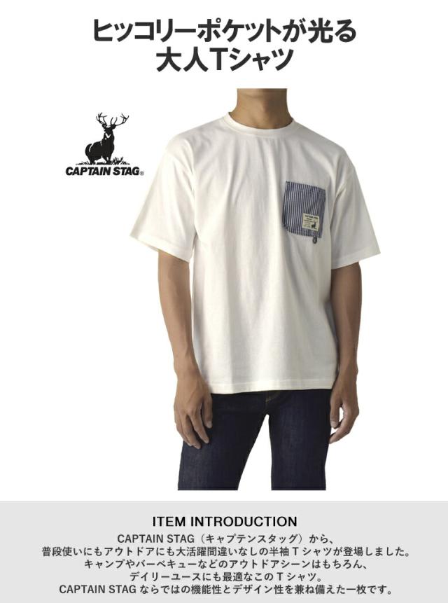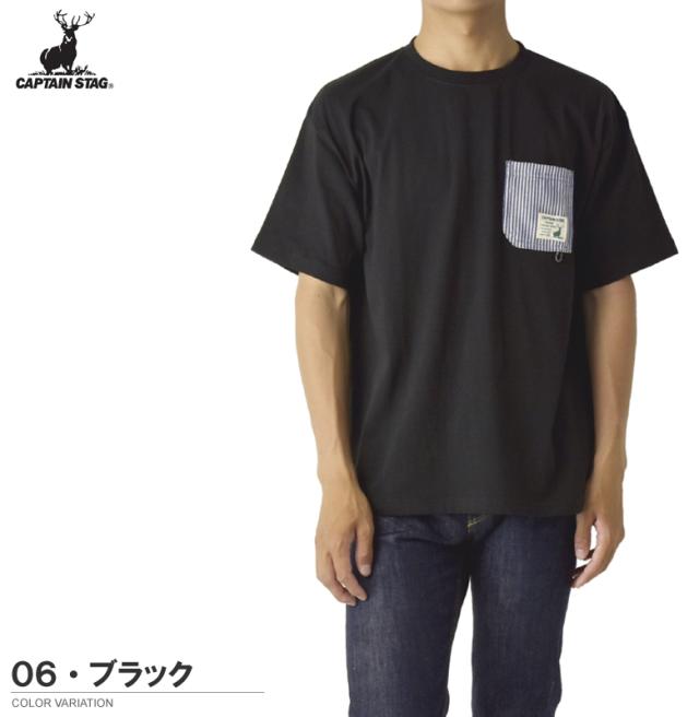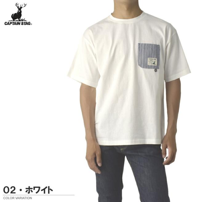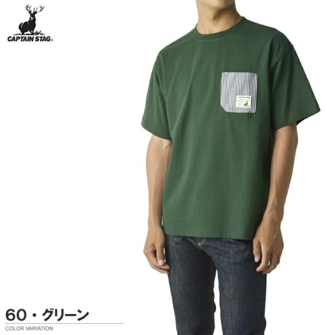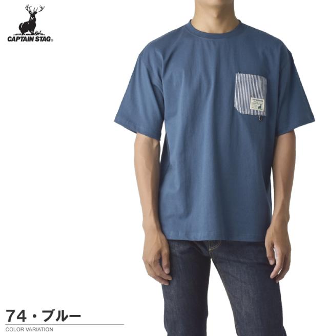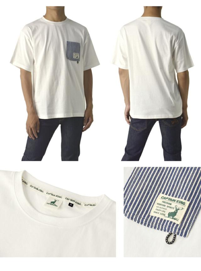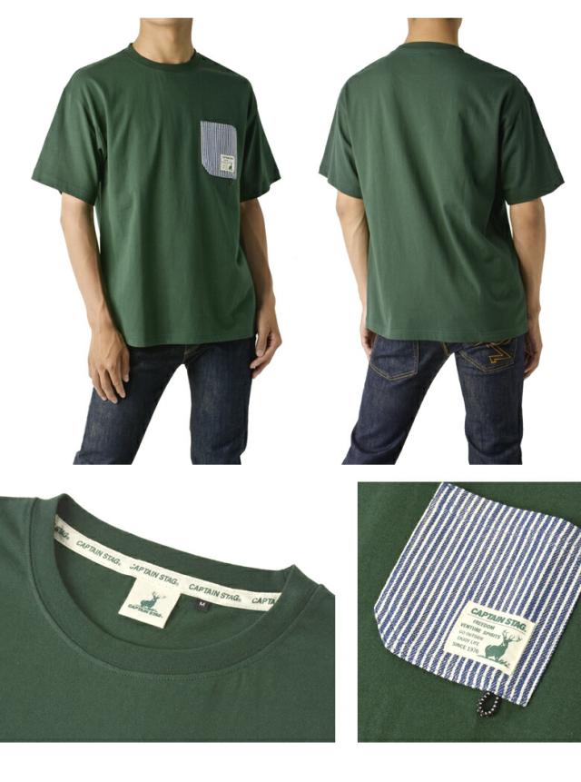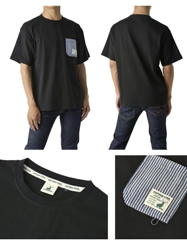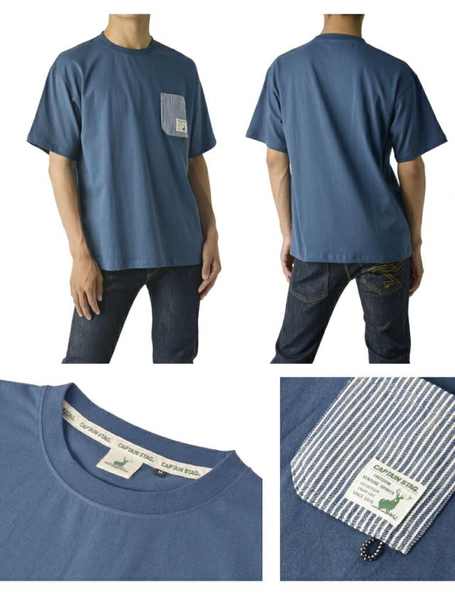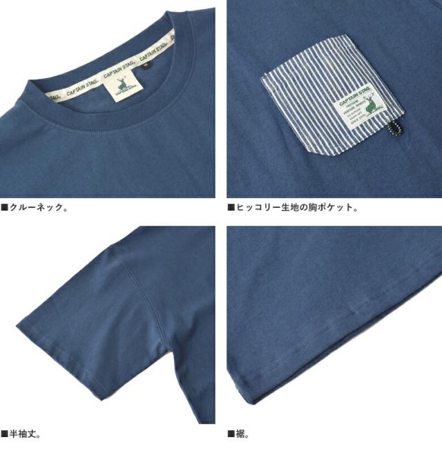 CAPTAIN STAG キャプテンスタッグ 半袖 Tシャツ メンズ 胸ポケット ヒッコリー 切替 無地 カジュアル アウトドア キャンプ レジャー 鹿ロゴ【B2K】【パケ2】