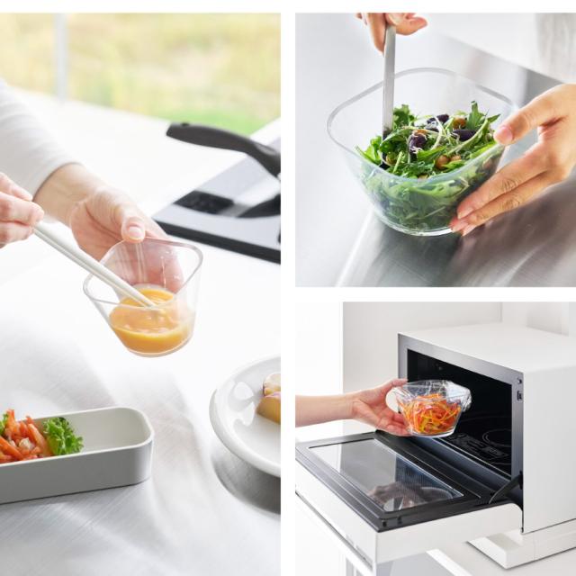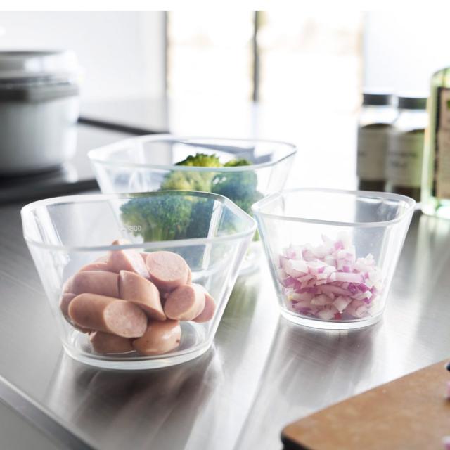 電子レンジOK。軽くて扱いやすく、計量できる下ごしらえボウル。電子レンジも使用可能で、計量してそのまま電子レンジでの調理ができるのでお菓子作りの際にも便利。