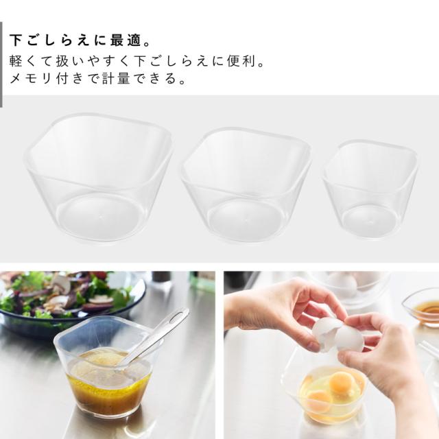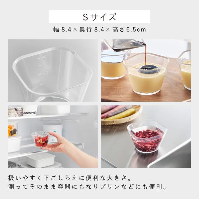Sは、扱いやすく下ごしらえに便利な大きさ。測ってそのまま容器にもなりプリンなどにも便利。