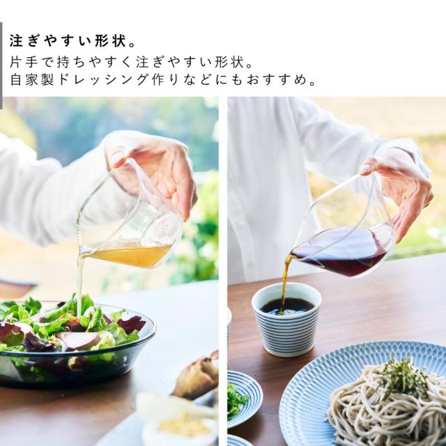 片手で持ちやすく注ぎやすい形状。水切れがよく、自家製ドレッシング作りなどにもおすすめ。