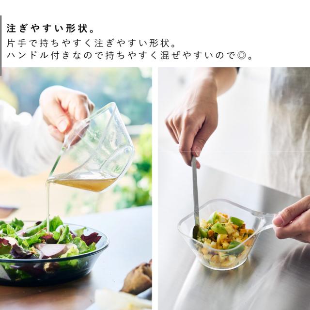 片手で持ちやすく注ぎやすい形状。自家製ドレッシング作りなどにもおすすめ。ハンドル付きなので持ちやすく混ぜやすいので◎。