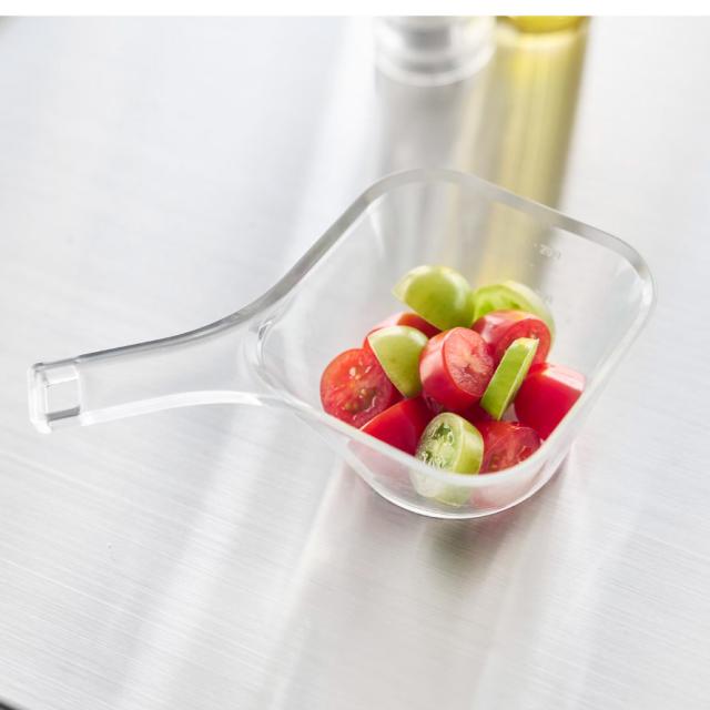 電子レンジOK。メモリ付きで計量できるハンドル付きボウル。軽くて扱いやすく下ごしらえに便利なサイズ感のSサイズ。