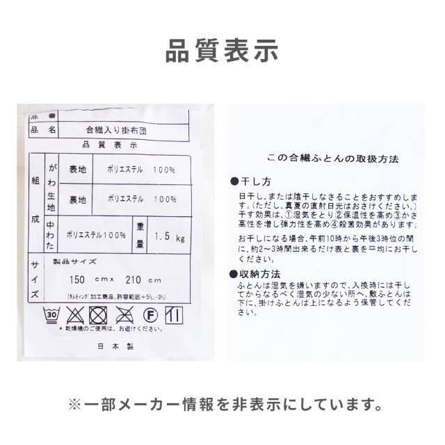 | ・日本製 合繊掛け布団 合繊を使用したスタンダードな掛け布団。中綿は抗菌防臭、防ダニ効果のある東洋紡フィルハーモニィを使用しています。ホコリが出にくく、動物由来の中材に比べてダニの発生が極めて少ないのも魅力の一つ。普段はしまっておきたい方にも安心です。中わたが1.5kg入っていてふんわり気持ちいい。羽毛や羊毛独特のニオイが苦手な方にも快適にお使いいただけます。 | |