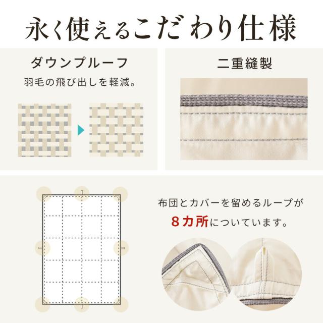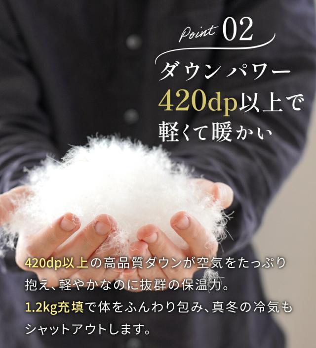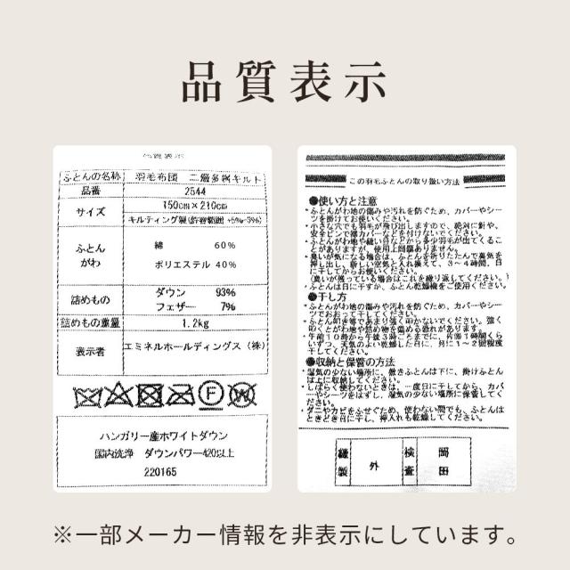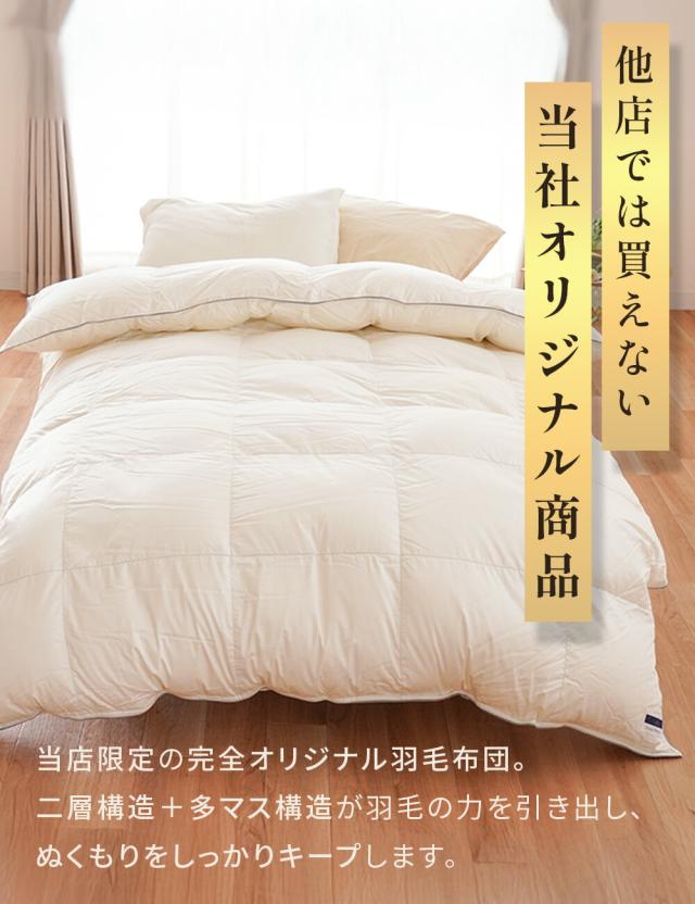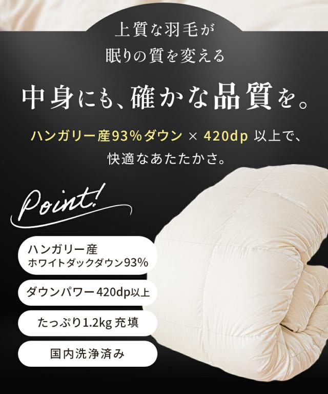 | ・当店でしか買えないオリジナル商品 当店だけの完全オリジナル羽毛布団。二層構造+多マス構造が羽毛の力を引き出し、ぬくもりをしっかりキープします。 ・あたたかさを蓄える、二層多マス構造上下でマス数を変えた“多マス設計”により、羽毛の片寄りやすいマチ部分からの放熱を抑制。二層構造があたたかさをしっかりキープし型崩れしにくく、心地よさが続きます。 ・上質な羽毛で眠りの質を変えるハンガリー産93%ダウン×420dp以上で、快適なあたたかさ。 ・ハンガリー産ホワイトダックダウン93%ダウンの名産・ハンガリーの専門農場で育ったホワイトダックのダウンを93%使用。寒暖差で育った大粒ダウンはかさ高・弾力・保温力に優れています。 ・ダウンパワー420dp以上で軽くて暖かい420dp以上の高品質ダウンが空気をたっぷり抱え、軽やかなのに抜群の保温力。1.2kg充填で体をふんわり包み、真冬の冷気もシャットアウトします。 ・国内洗浄でふっくら清潔日本国内工場で基準を上回る徹底洗浄。におい・アレルゲンを抑え、届いてすぐに清潔で安心して使えます。 ・安心安全の日本製羽毛の洗浄から縫製まで国内一貫生産。熟練職人が均一で美しい仕上がりを実現します。 | |