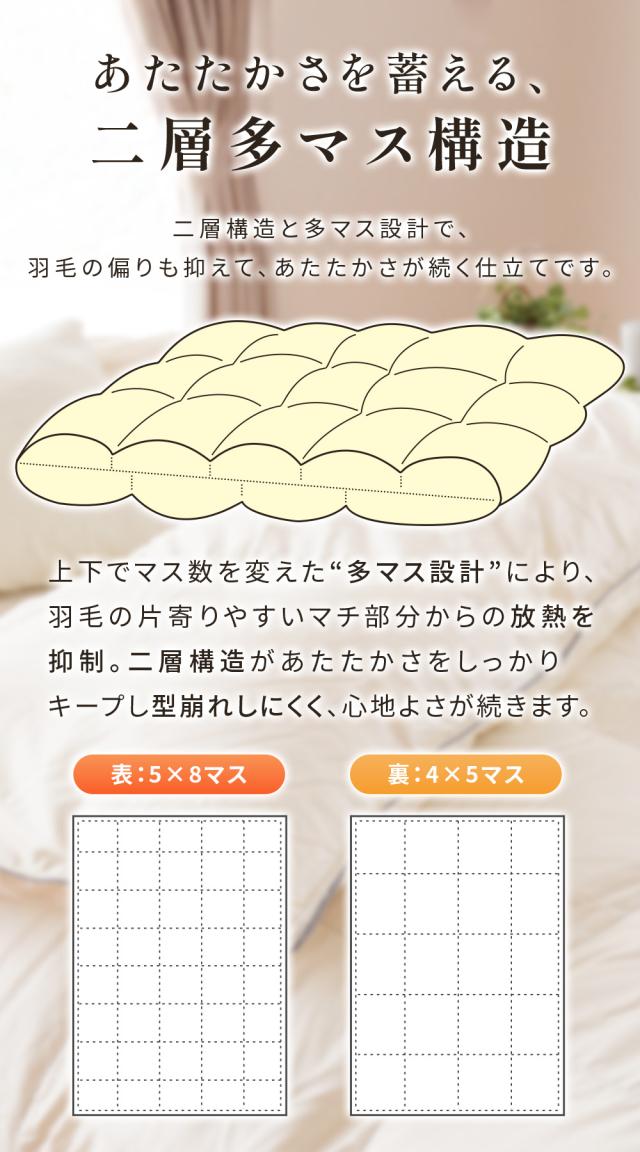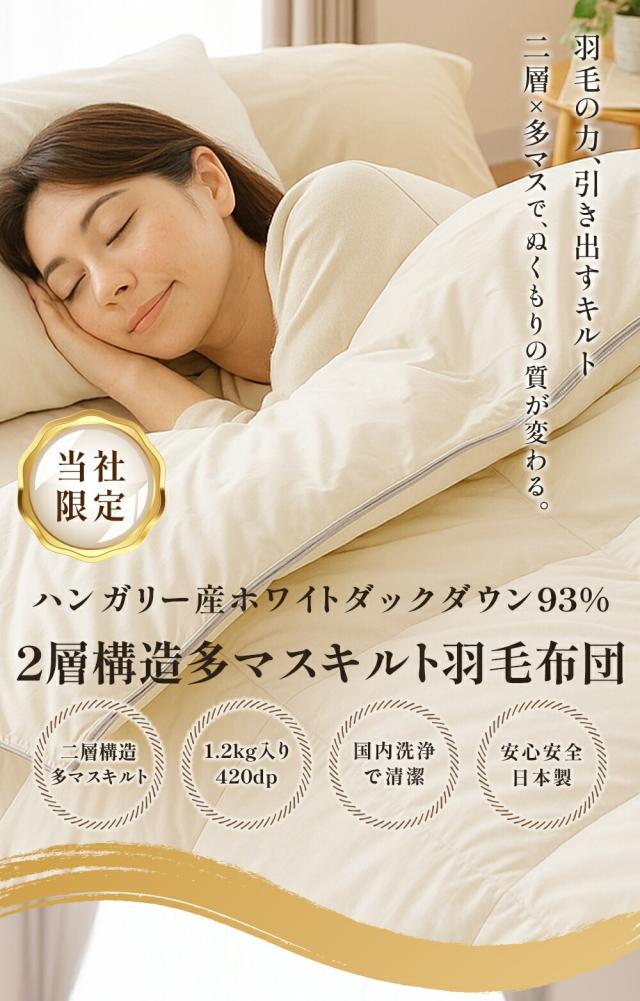 [keyword|二層構造 多マスキルト 羽毛布団 ハンガリー産ダウン ホワイトダックダウン93% ダウンパワー420dp以上 1.2kg充填 側生地 国内洗浄済み 日本製 偏りにくい羽毛布団 型崩れしにくい 保温力が続く アレルゲン対策 におい軽減 高品質羽毛布団 秋冬用布団 暖かい掛け布団 敏感肌対応寝具 通気性 吸湿性 朝まであたたかい布団 ]