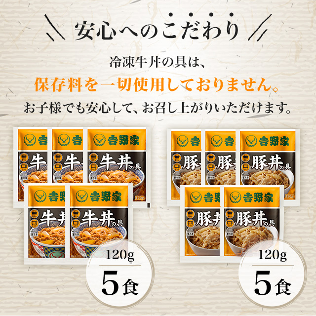 商品名 吉野家 牛丼の具、豚丼の具 10食セット(牛丼の具120g×5食、豚丼の具120g×5食) 容量 牛丼の具:120g×5食