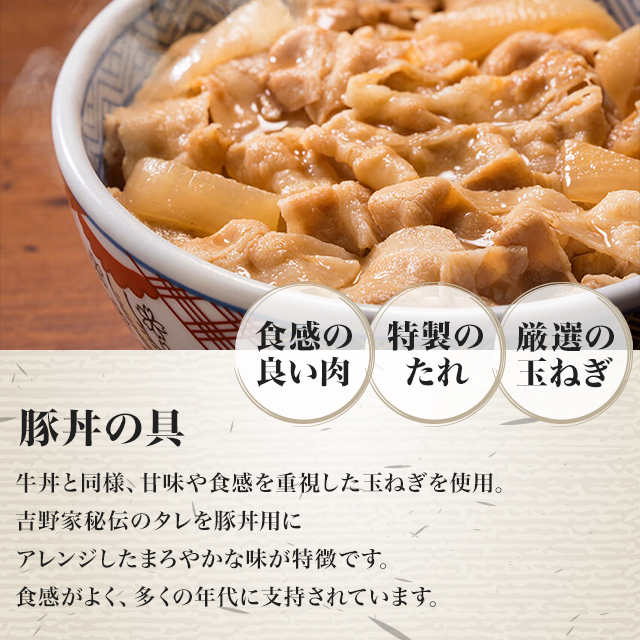 牛丼と同様、甘味や食感を重視した玉ねぎを使用。吉野家秘伝のタレを豚丼用にアレンジしたまろやかな味が特徴です。食感がよく、多くの年代に支持されています。