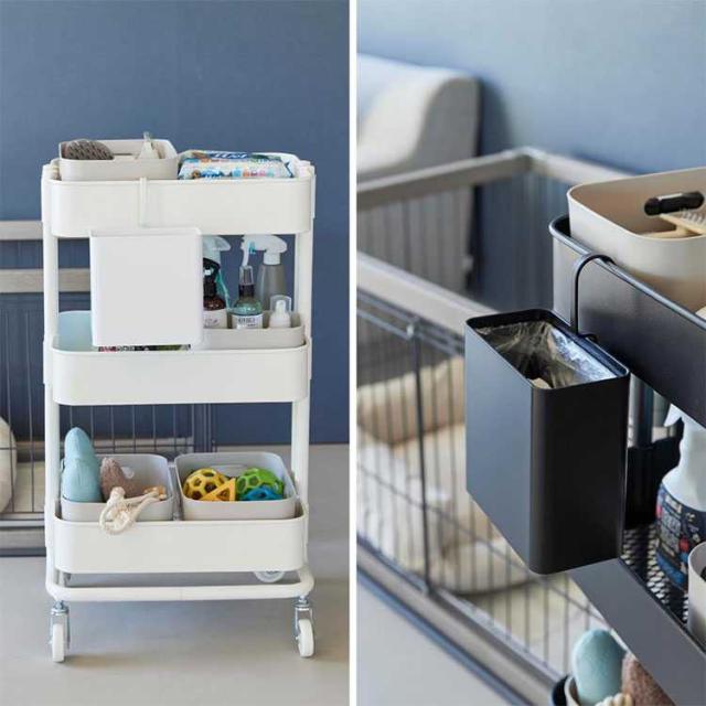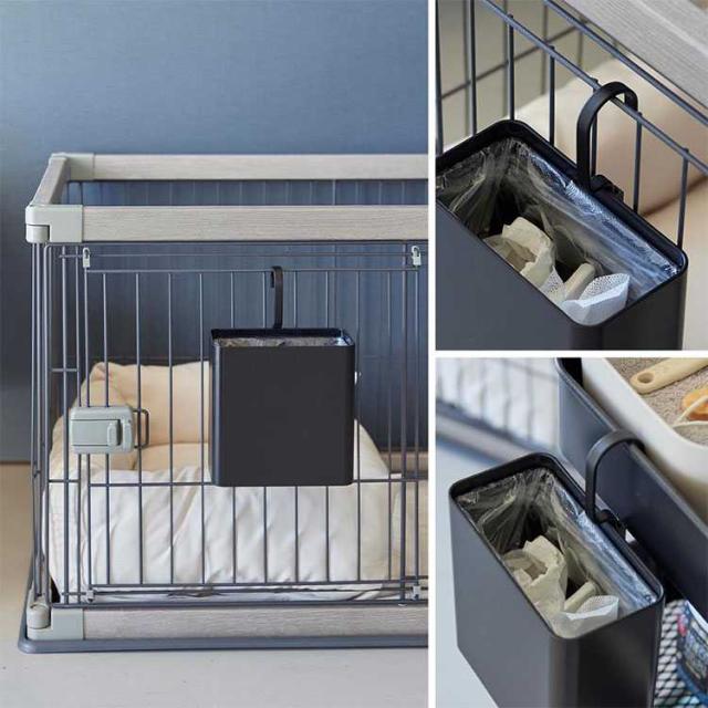 お好みの場所に引っ掛けて設置できるゴミ箱。フックを差し替えるだけで90度ずつ4方向にゴミ箱の向きを変えることができます。リビングや書斎、洗面所のタオルバーやペットケージ、ワゴンなどの設置場所に合わせてお好みの向きに引っ掛けてられるので便利。