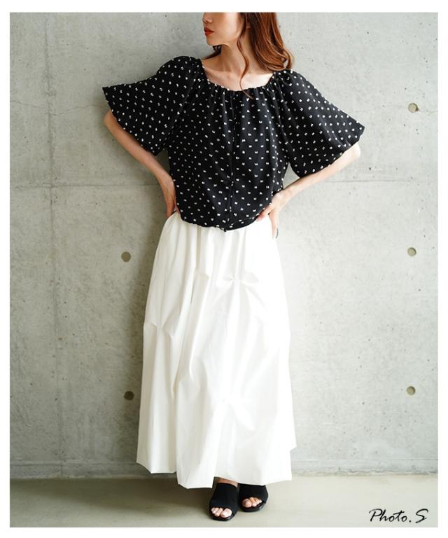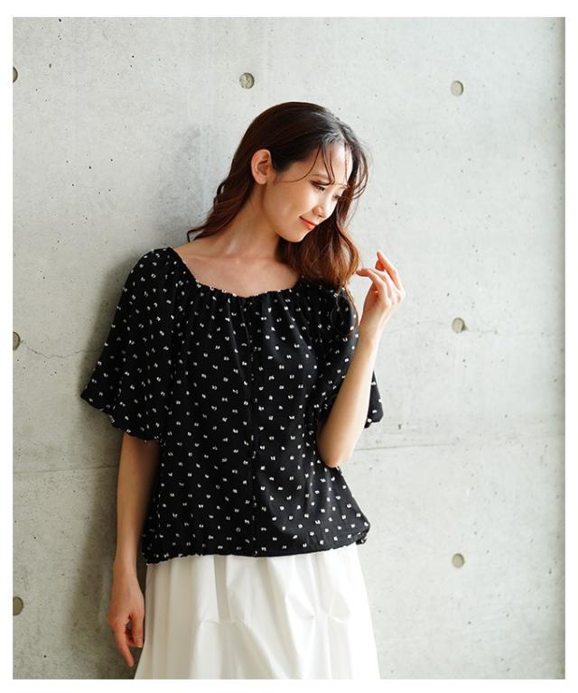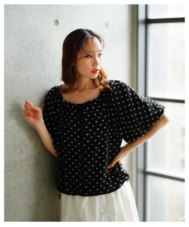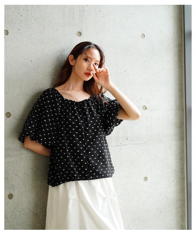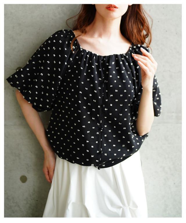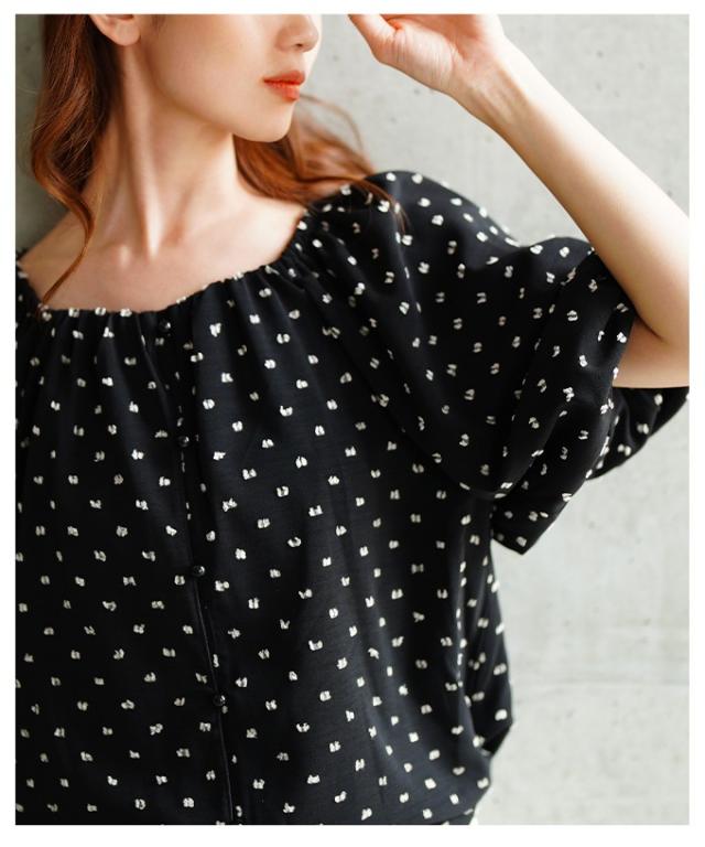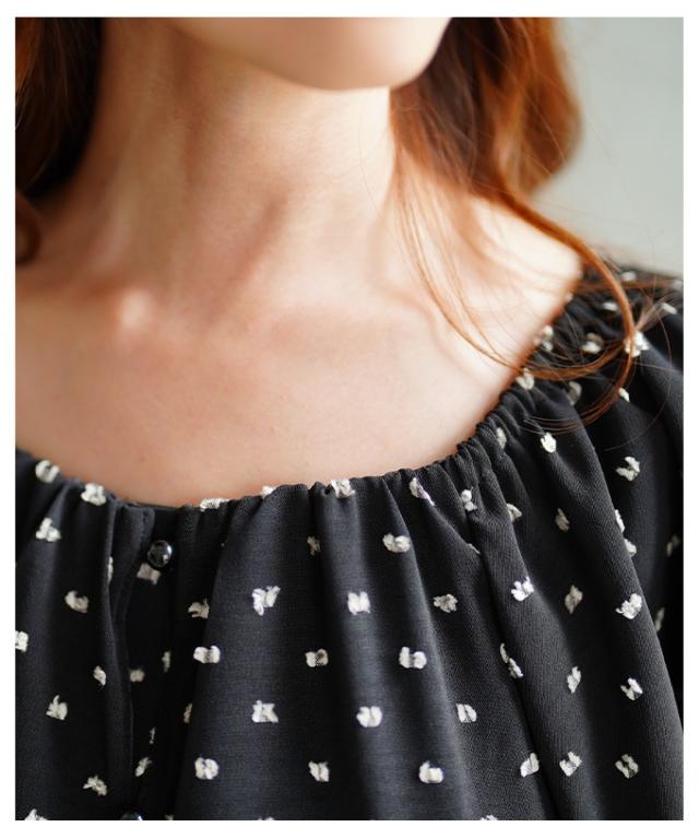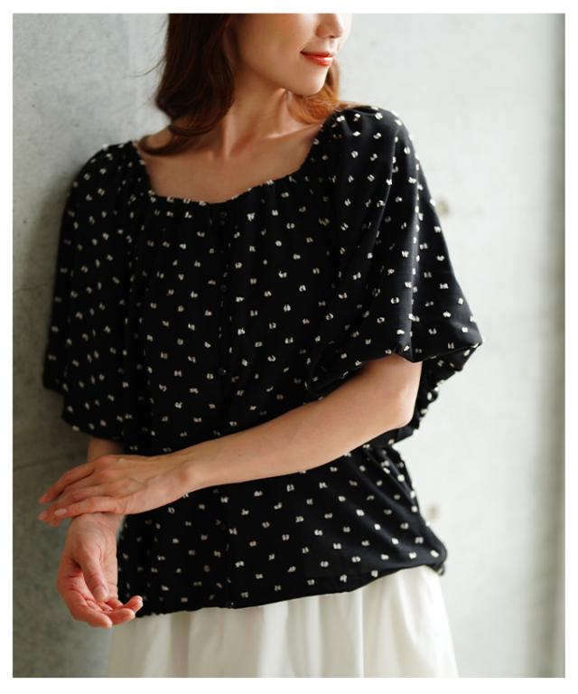 特徴: ドット 総柄 パフスリーブ ギャザー ボタン ドロスト スクエアネック