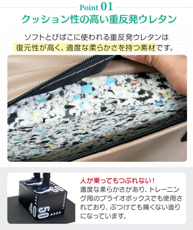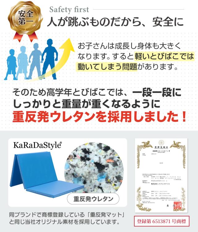 【安定性を重視した重反発ウレタン】KaRaDaStyleが商標登録しているしっかりとした重量の「重反発マット」と同じ素材を使用!復元性・クッション性の高い素材でズッシリと重さがあるため、60kgの成人男性が飛んでもズレにくいとびばこを作りました。