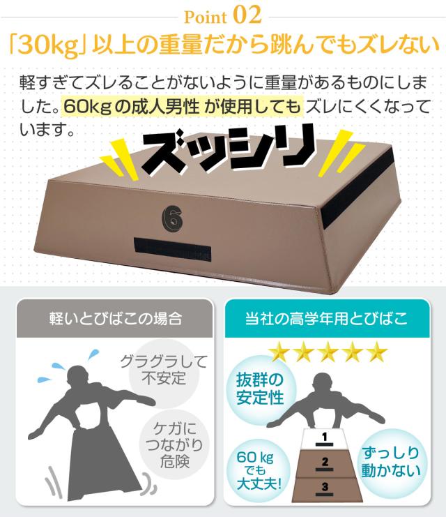 【「ソフトとびばこ」の新タイプ登場】2年間で4,000個以上販売実績のある「KaRaDaStyleソフトとびばこ」から、高学年向けタイプが登場!大人が使ってもズレにくいしっかりした重量で、高さ60cmの3段セットからMAX120cmにもなる6段セットまでご用意しました。