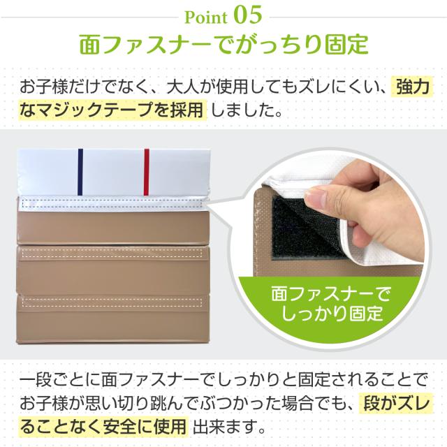 【安全にこだわりました】大人が使用してもズレにくい強力なマジックテープを採用。一段ごとにしっかりと固定されるので、ぶつかってしまってもズレることなく安全に使用できます。また製造上必要なファスナーも、ケガをしないようカバーをつけた安全設計となっております。