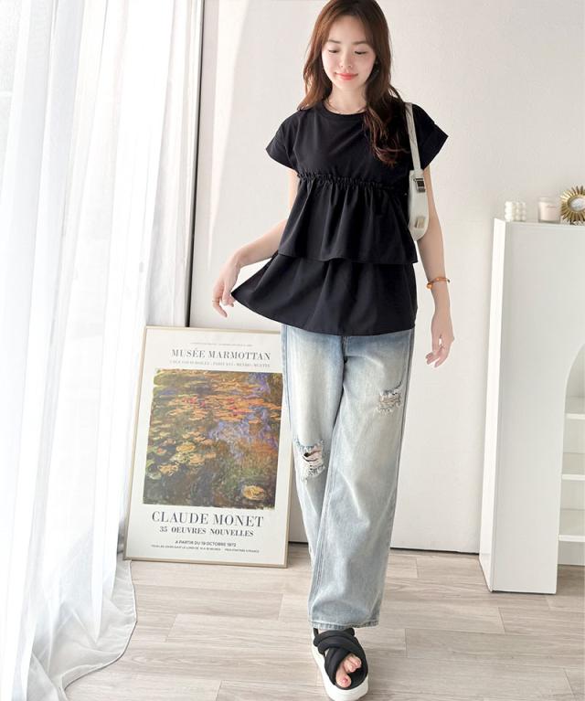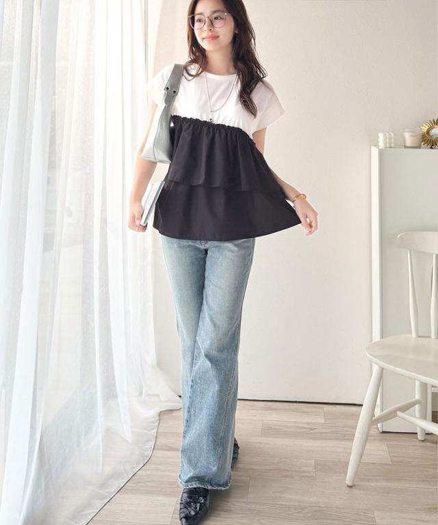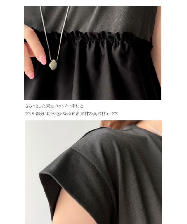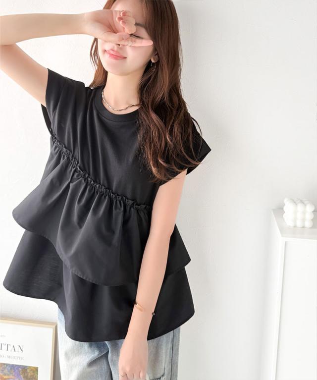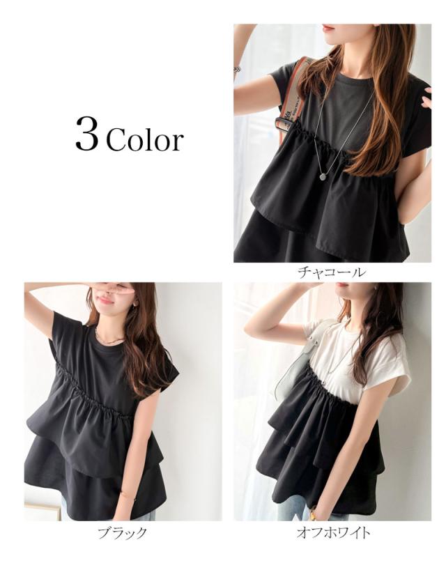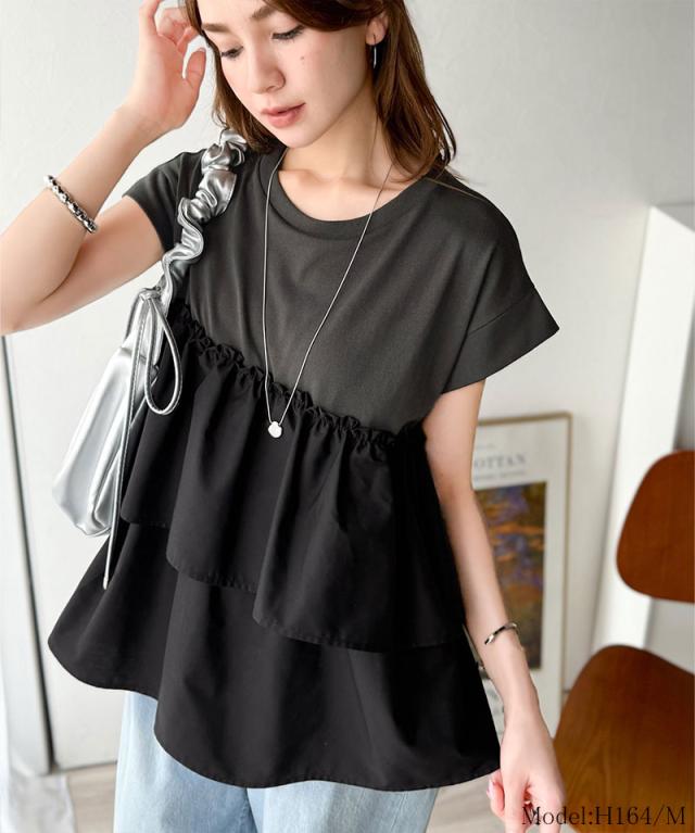 さらっとしたカットソーとふんわりフリルの切り替えデザインが特徴。