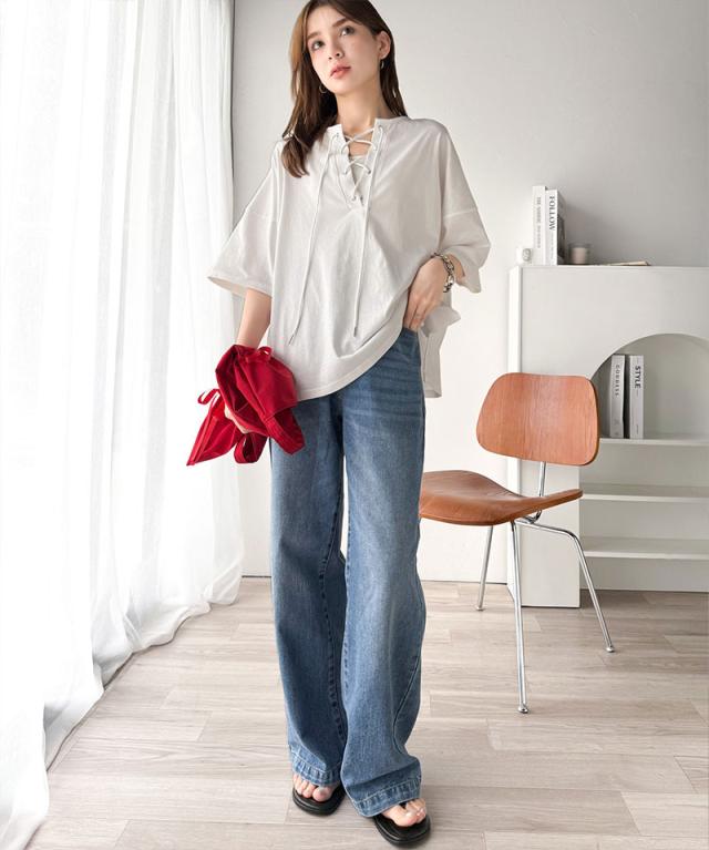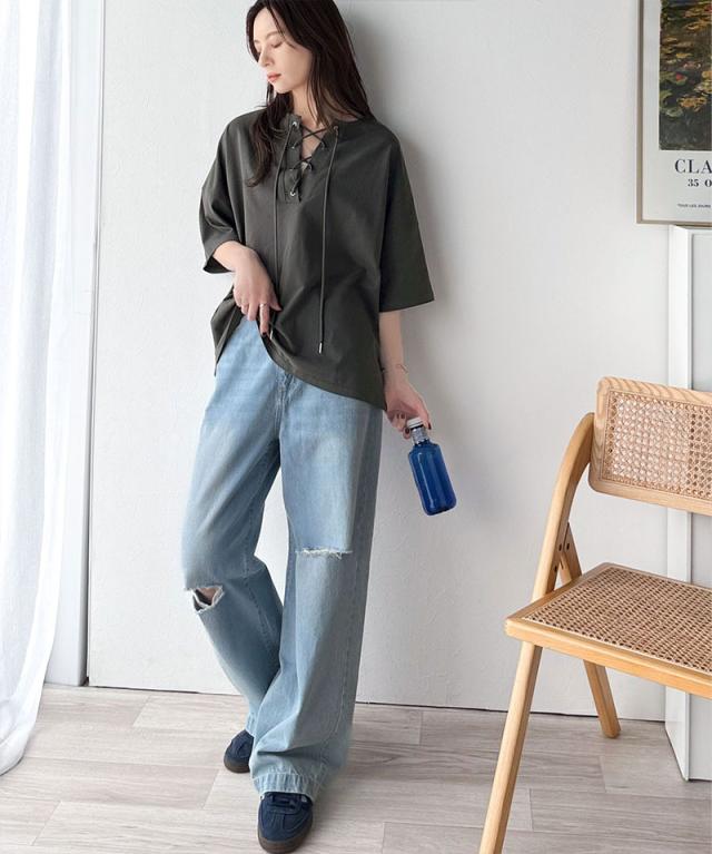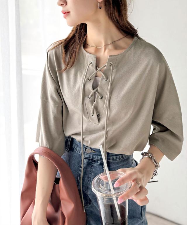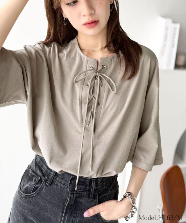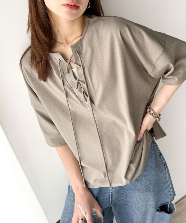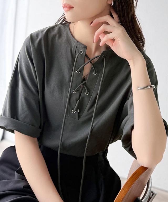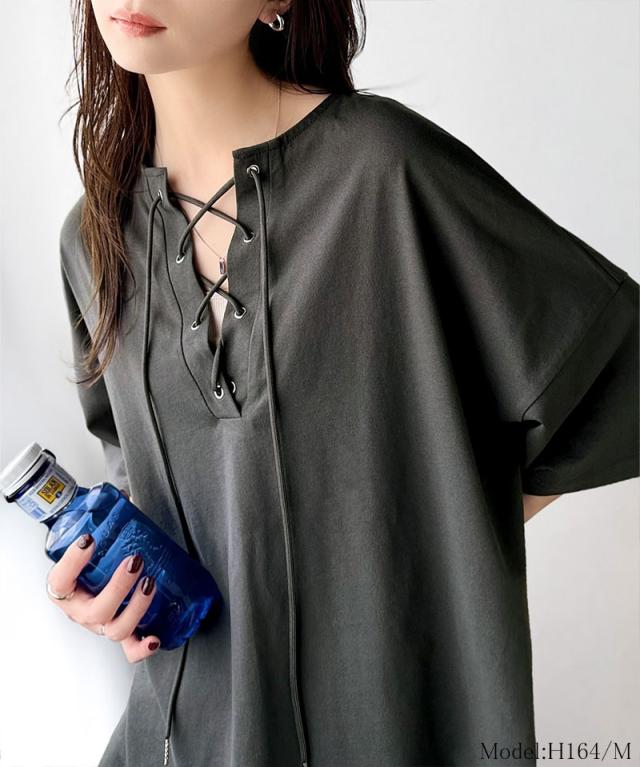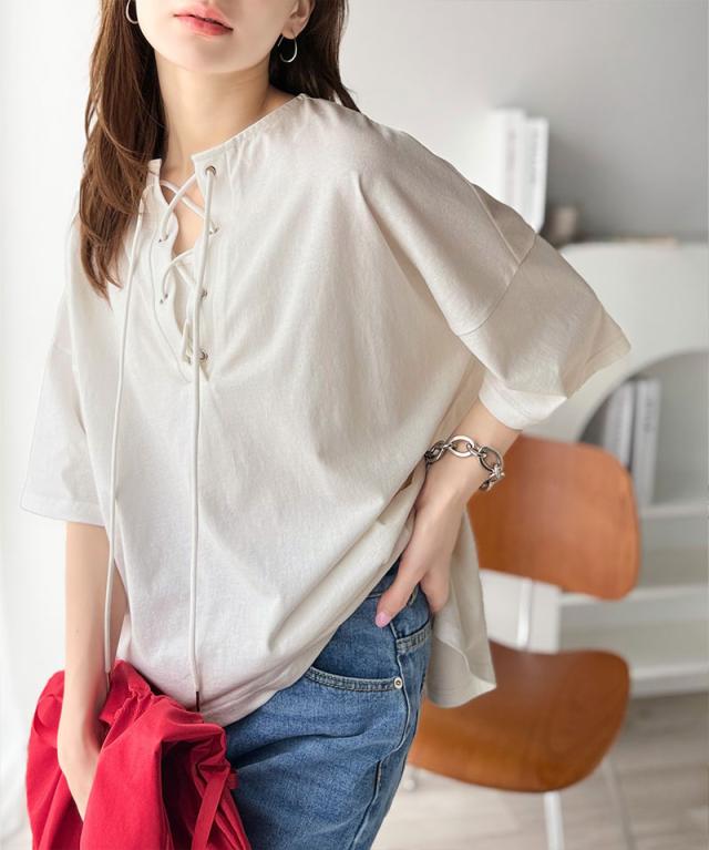 クラシカルエルフ冬新作 javaジャバコラボ トップス Tシャツ レディース 綿100% バック ロゴ プリント 胸元 レースアップ T 半袖 大きいサイズ 2025ss jv1260458