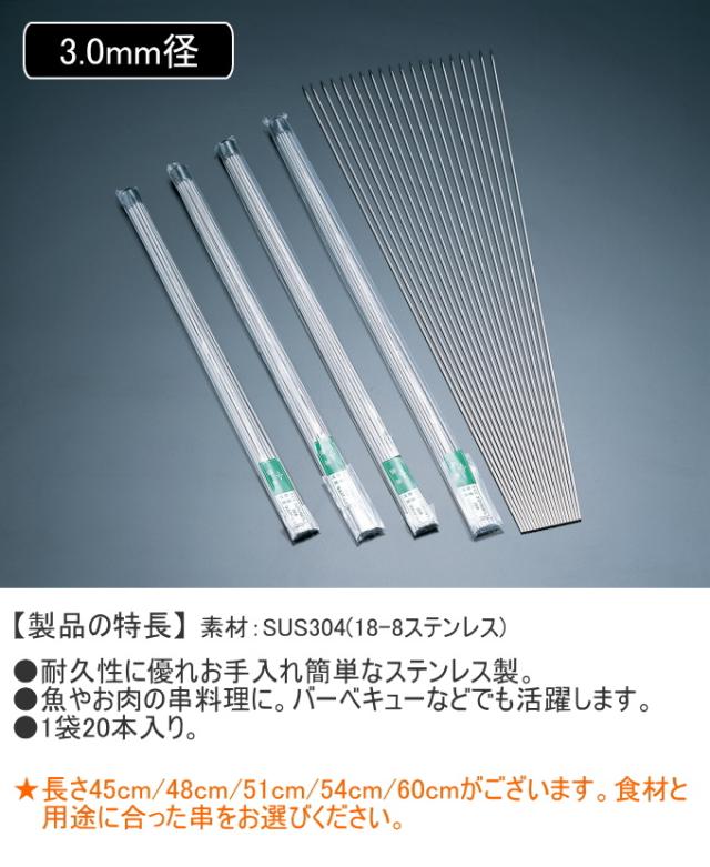 18-8 魚串 3.0mm径 60cm 20本入 日本製 18-8ステンレス 串 魚串 くし 焼き串 20本入 太さ3.0mm 焼き魚 焼き鳥 バーベキュー 串料理 シルバー 丈夫 キッチン キッチン用品 調理 調理道具 赤川器物製作所