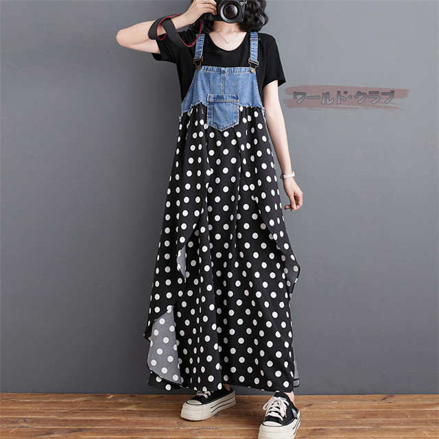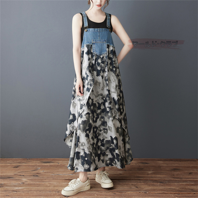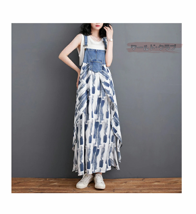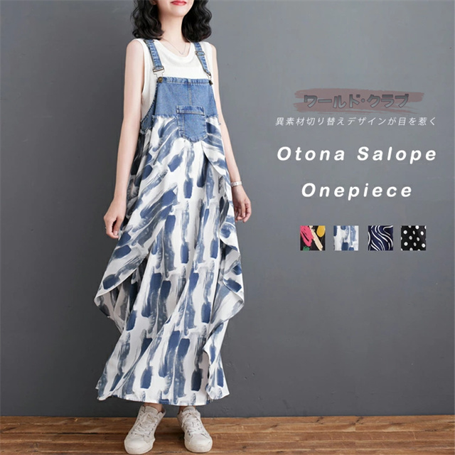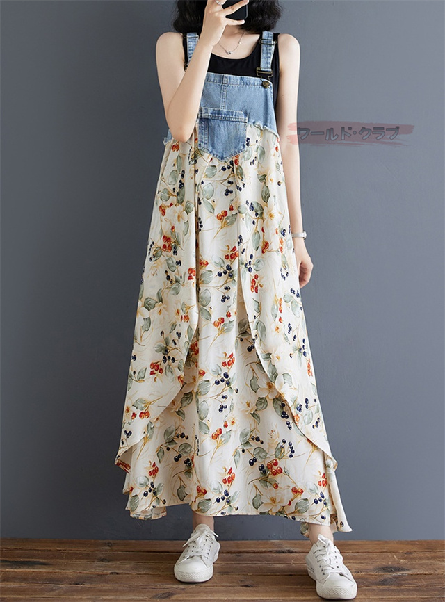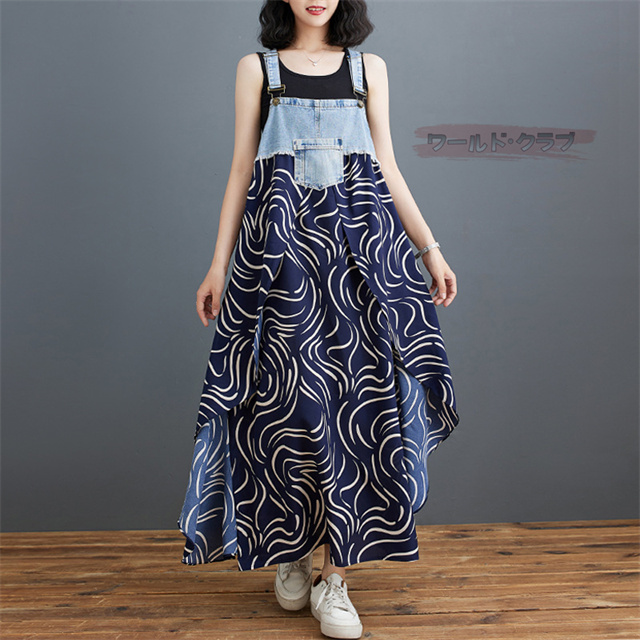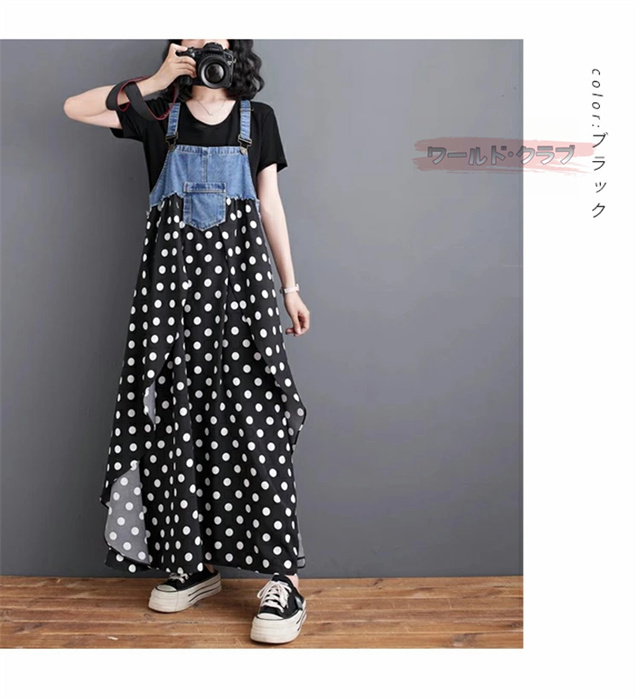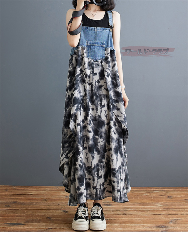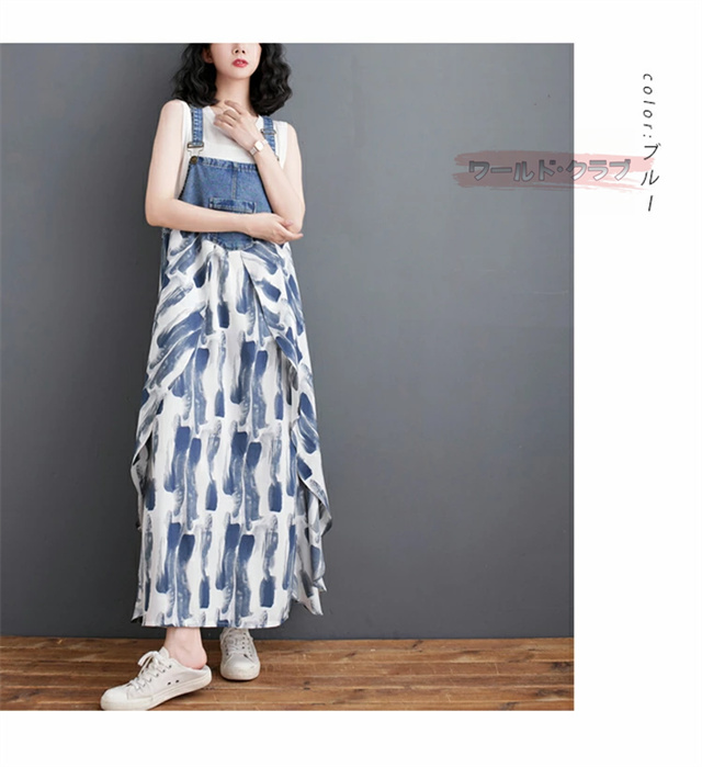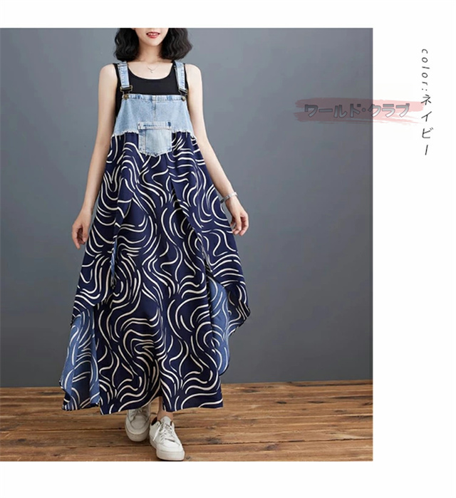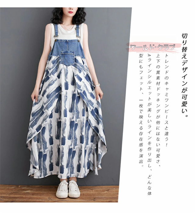 サロペットワンピース レディース オールインワン 切り替え デニム サロペット 異素材 切り返しデザイン デニムサロペット ワンピ ロング レディースファッション ゆったり 楽ちん オーバーサイズ 体型カバー マタニティ 春 夏 秋 大人