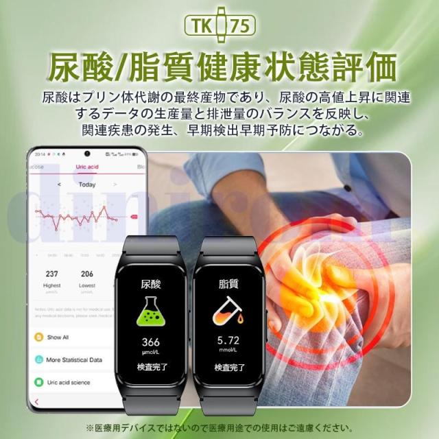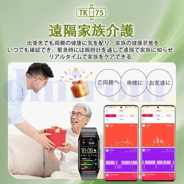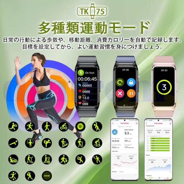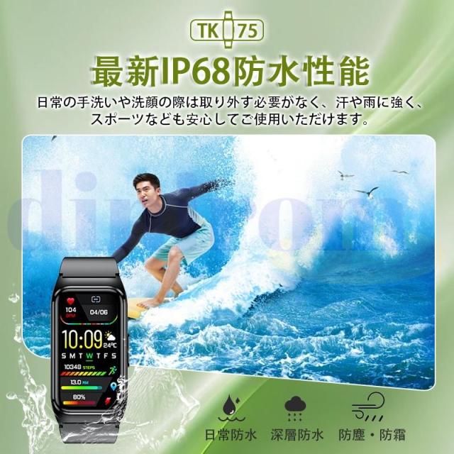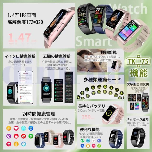 【多機能健康管理&睡眠モニター】五臓脂肪検査、血中脂質、尿酸、血圧測定、ECG心電図、24時間定時体温測定、高精度心拍数、血中酸素などの機能画面に切り替え、ワンタッチで測定を開始すると、測定結果が一目でわかります。また、自動測定機能をオンにすると、自動的にデータをアプリに同期させることができ、さらにAI分析が健康状態の把握に役立ちます。ただし、本デバイスは医療机器ではありませんので、提供するデータはあくまでリスク評価用ですので、予めご了承ください。このウォッチは、深い睡眠、軽い睡眠、レム睡眠を記録するだけでなく、専用アプリが睡眠状況を詳細に分析し、睡眠の質に応じた睡眠アドバイスを提供します。普段は目に見えない睡眠の質を知れば、よりよい睡眠を意識した健康的な生活を送りやすくなります。【着信通知&文字盤DIY】スマートウォッチを手首や腕に装着して使用することで、両手を解放されないときスマートフォンなどを取り出すことなく、簡単に来電、Line、Twitter、SMS、メール等の情報を得ることができます。激しく動いても邪魔になりにくいため、会議中、家事中メッセージをチェックするのにぴったりです。また、ウォッチに5つの文字盤内蔵、アプリに約50+種類の文字盤を無料で自由変換、文字盤カスタマイズも可能ことで、シンプル?スタイリッシュ?キュートな画面など、その日の気分に応じて切り替えられます。【進化した1.47インチHD大画面&文字盤自由設定】このスマートウォッチは業界初の1.57インチ大画面のタッチパネルを採用し、老眼の方にも見やすい!画質がより鮮明になり、高精度な大画面で通知や文字が一目瞭然に表示される。上下左右のスライド操作で機能の切替も簡単です。本体で6つの表盤画面搭載する以外、専用アプリで100+種類の文字盤を自由に設定することができます。他に、家族、恋人、アイドル、及びペット等の好きな写真も文字盤に設定可能で毎日新鮮さを味わえる。【日本語アプリ&安心保証】 日本語アプリは、Google Play StoreおよびApple Storeからダウンロードできる、ほかQRコードを読み取ってダウンロードすることも可能です。出品者からのご購入いただいた商品が対象商品となり、ご購入日から1ヶ月の保証期間があります。