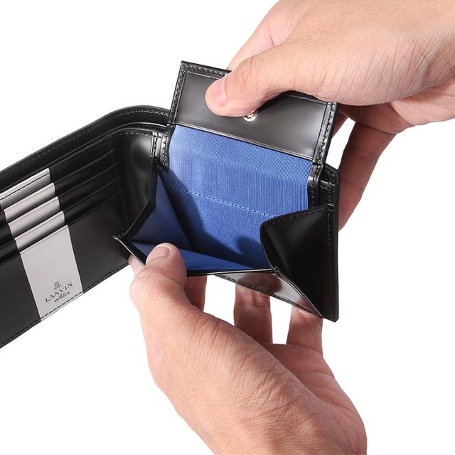 マチが広く、小銭の出し入れがしやすいコインケースを配置。内装はすべて上品なブルーを採用。