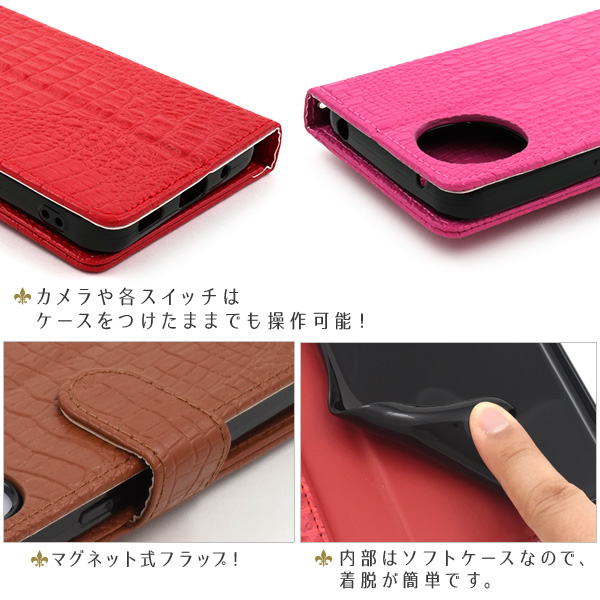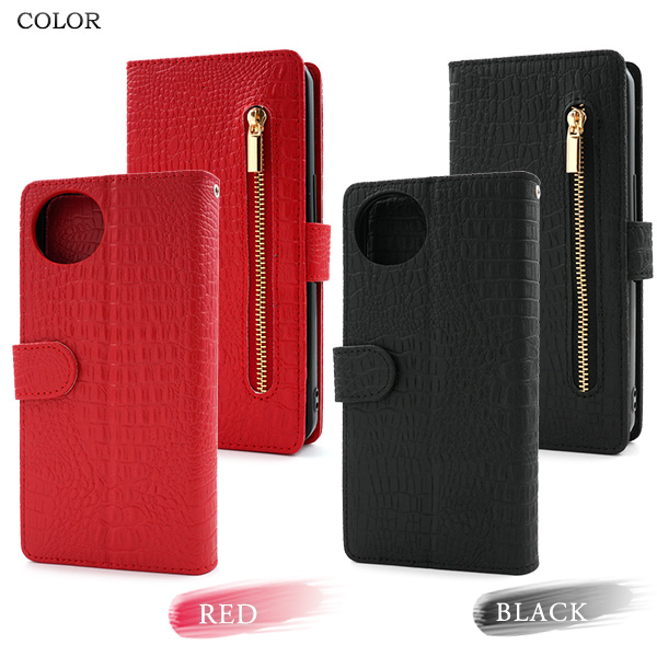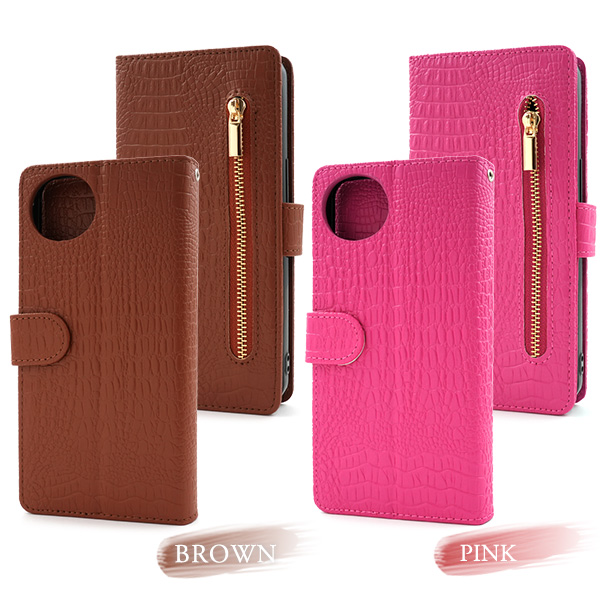 衝撃やキズなどからスマートフォンを守ります。 また、内部はソフトケースなので着脱が簡単です。 背面を折り返すとスタンドとして使用できるので、動画視聴に便利です。 横開きタイプなので、手帳のように使うことができます。 落下防止に最適なストラップホール付きです。 外側にファスナーポケットが付いているので、ちょっとした財布や小銭入れ代わりになって便利! また、内側に2つのカードポケットとサイドポケットが付いています。 高級感溢れるクロコダイルレザーデザイン。 ビジネスやカジュアルなど様々なシーンで活躍します。 | ||||||||||||||