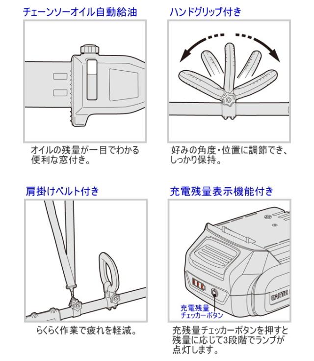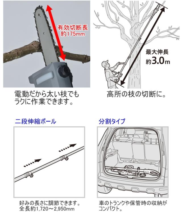 | 特徴 | 高所の枝の切断に。 ●有効切断長:約175mm ●最大伸長:約3.0m ●二段伸縮ポール。全長約1,720〜2,950mmまで調節できます。 ●分割タイプ。車のトランクや保管時の収納がコンパクト。 ●チェーンソーオイル自動給油。オイルの残量が一目でわかる便利な窓付き。 ●ハンドグリップ付き。好みの角度・位置に調節できます。 ●肩掛けベルト付きで疲れを軽減。 ●充電残量表示機能付き。 ※高額取り寄せ品のため、ご注文後のキャンセル、返品はお受けできませんのでご了承ください。 ■そのほかの農業・園芸用機器はこちら↓ 農業・園芸用機器 |