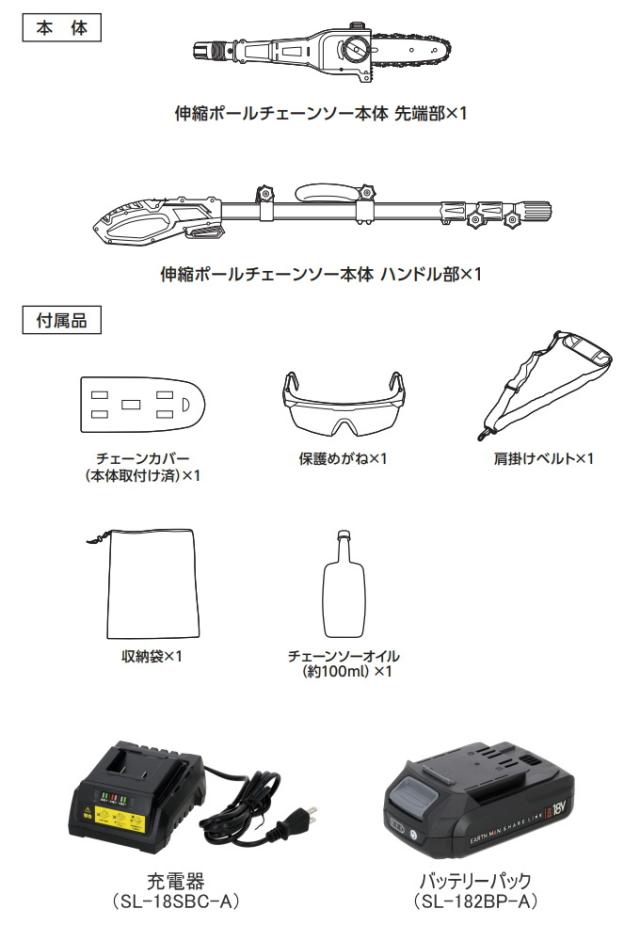 | セット内容 | ●伸縮ポールチェーンソー本体先端部×1 ●伸縮ポールチェーンソー本体ハンドル部×1 ●18V専用充電器×1 ●18V専用バッテリーパック(2.0Ah)×1 ●チェーンカバー(本体取付け済)×1 ●肩掛けベルト×1 ●保護めがね×1 ●チェーンソーオイル(約100ml)×1 ●収納袋×1 ●取扱説明書×1 |