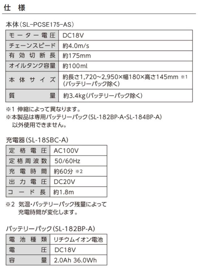 | 充電器(SL-18SBC-A) | 定格電圧:AC100V 定格周波数:50/60Hz 充電時間:約60分(※気温・バッテリーパックの残量によって充電時間が変化します。) 出力電圧:DC20V コード長:(約)1.8m |