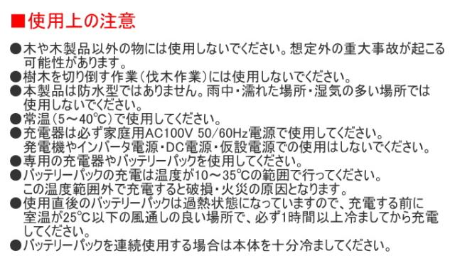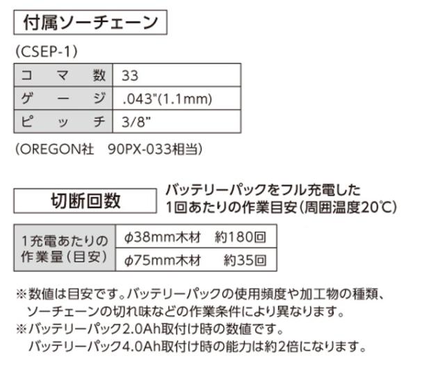 | 切断回数 | ●1充電あたりの作業量(目安) Φ38mm木材:約180回 Φ75mm木材:約35回 ※数値は目安です。バッテリーパックの使用頻度や加工物の種類、ソーチェーンの切れ味などの条件により異なります。 |