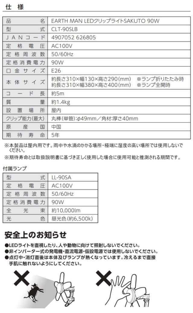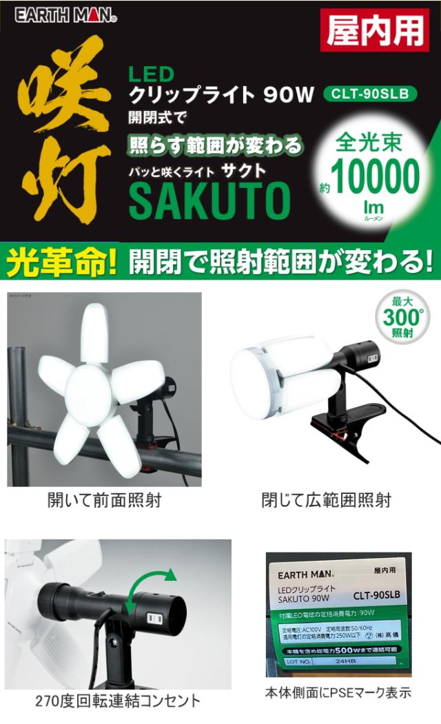 EARTH MAN LEDクリップライト SAKUTO 90W CLT‐90SLB 送料無料 屋内用 電動工具 作業灯 投光器 照明 ライト LEDライト LED投光器 連結コンセント付き 咲灯 90W アースマン EARTH MAN 高儀