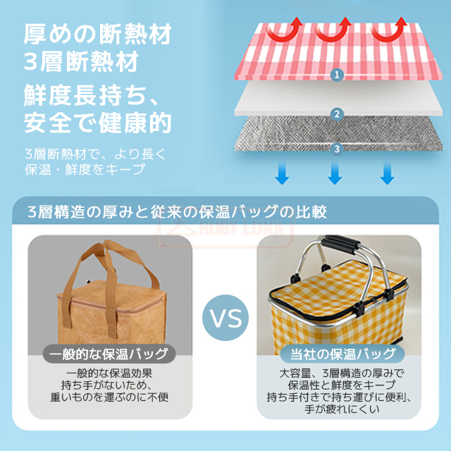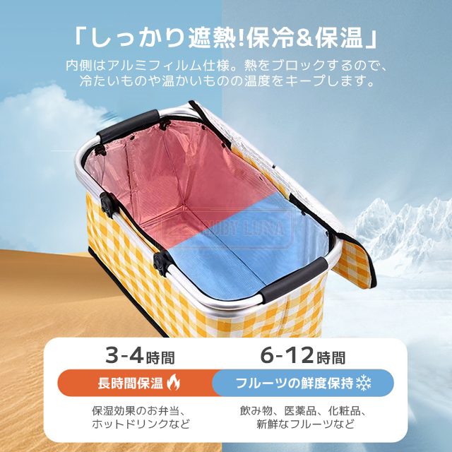 | 【保冷・保温、どちらにも使えて様々なシーンで活躍!】 | ◆アルミフィルムによる断熱性でボックス内の温変化を抑えます。保冷・保温どちらにもお使い頂けます。 |