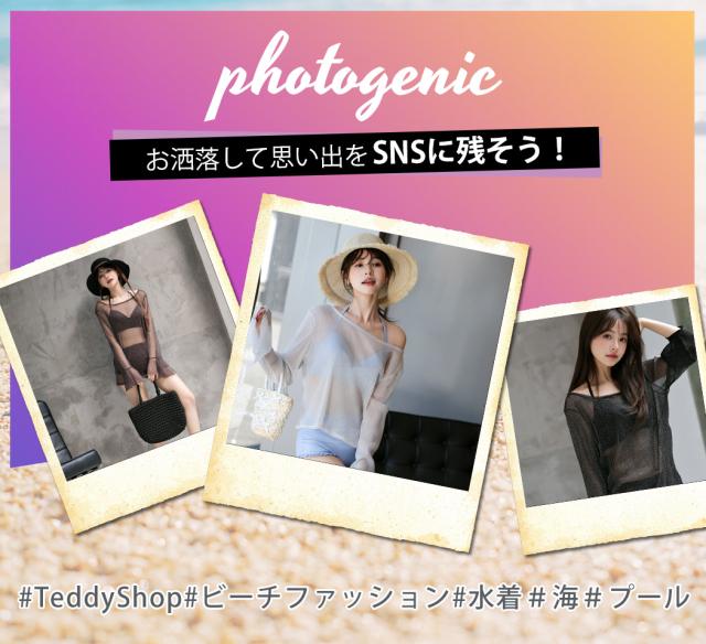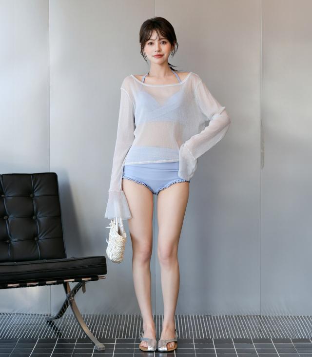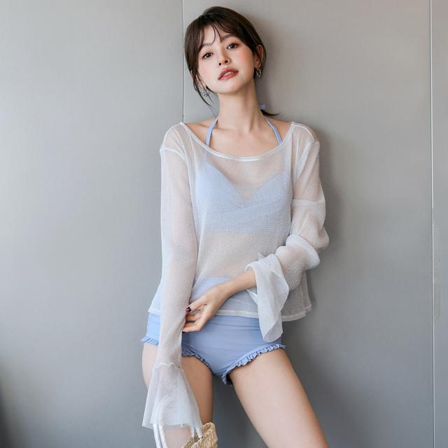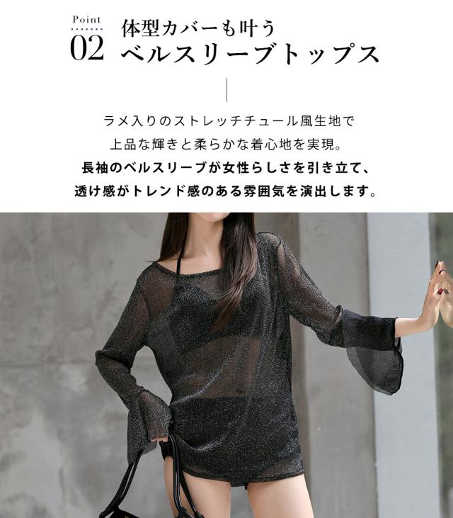 長袖のベルスリーブが女性らしさを引き立て、透け感がトレンド感のある雰囲気を演出します。