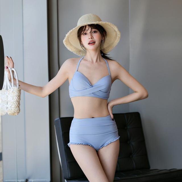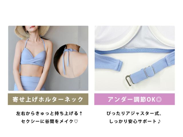 フロントクロスデザインとホルターネックで、胸元を美しく引き締めるシルエット。