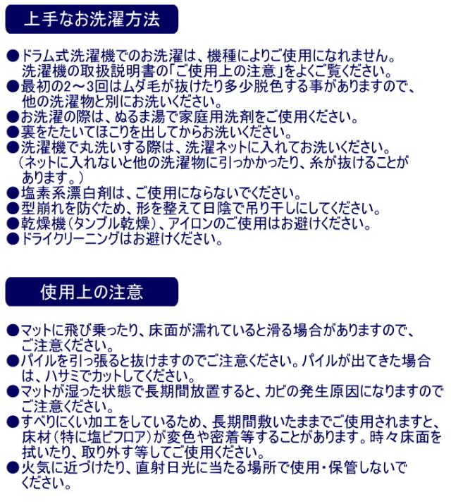 ドラム式洗濯機は機種によりご使用になれません。 洗濯機で丸洗いする際は、洗濯ネットに入れてお洗いください。 長時間敷いたままでご使用されますと、床材が変色や密着等することがありますので、時々床面を拭いたり、取り外す等してご使用ください。 乾燥機のご使用はお避けください。 |