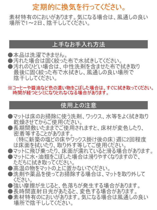 素材特有のにおいがあります。気になる場合は、風通しの良い場所で1〜2日、陰干ししてください。 本品は洗濯できません。 汚れた場合は、固く絞った布で水拭きしてください。 汚れのひどい場合は、中性洗剤を含ませた布で拭き取り、最後に固く絞った布で水拭きをし、風通しの良い場所で陰干ししてください。 コーヒーや醤油など色の濃い物をこぼした場合は、すぐに拭き取ってください。時間が経つとシミになり取れなくなる場合があります。 |