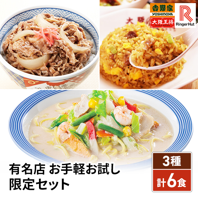 【ポイント増量中】 送料込み 有名店 お手軽お試し 限定セット 吉野家 大阪王将 リンガーハット 3種 計6食 吉野家牛丼の具120g×2、リンガーハット長崎ちゃんぽん305g×2、大阪王将直火炒めチャーハン230g×2 冷凍 牛丼 ちゃんぽん 王将 炒飯