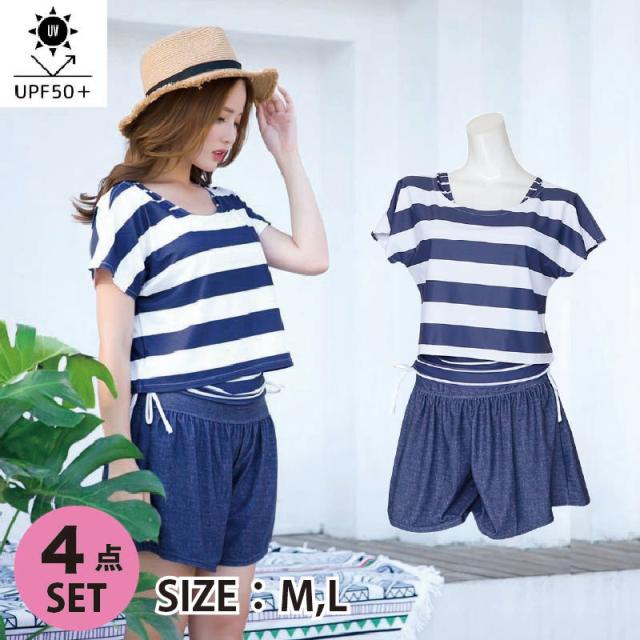 水着 レディース 体型カバー UPF50+ 4点セット ボーダー 洋服風 20代 30代 40代 ママ水着 ウエスト お尻 太もも カバーアップ 露出控えめ 大人 日焼け対策 マリン SET ネイビー SW822