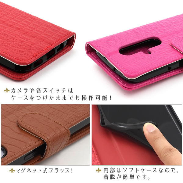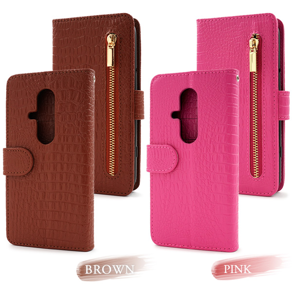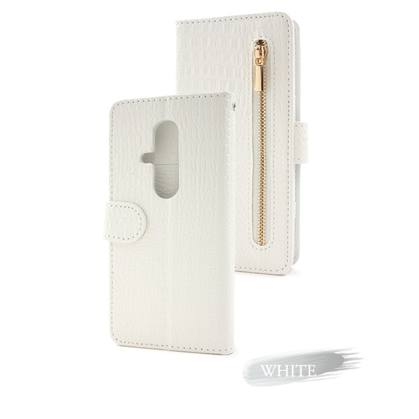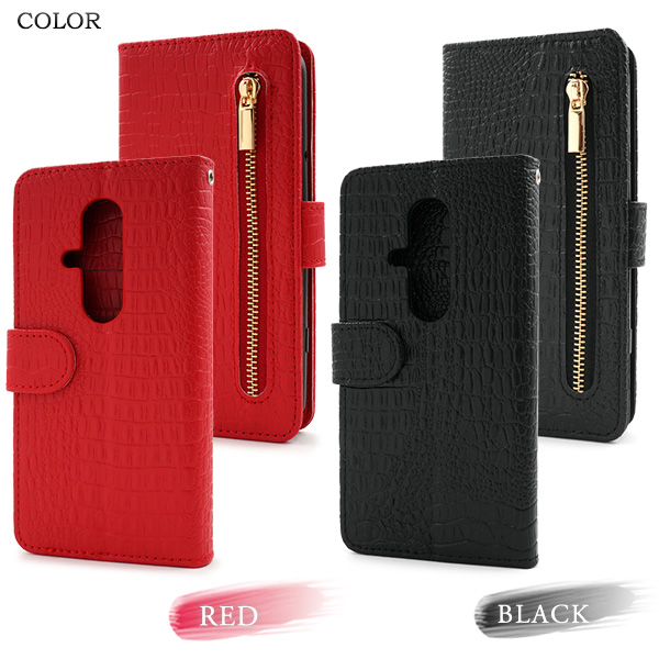 衝撃やキズなどからスマートフォンを守ります。 また、内部はソフトケースなので着脱が簡単です。 背面を折り返すとスタンドとして使用できるので、動画視聴に便利です。 横開きタイプなので、手帳のように使うことができます。 落下防止に最適なストラップホール付きです。 外側にファスナーポケットが付いているので、ちょっとした財布や小銭入れ代わりになって便利! また、内側に2つのカードポケットとサイドポケットが付いています。 高級感溢れるクロコダイルレザーデザイン。 ビジネスやカジュアルなど様々なシーンで活躍します。 | ||||||||||||||