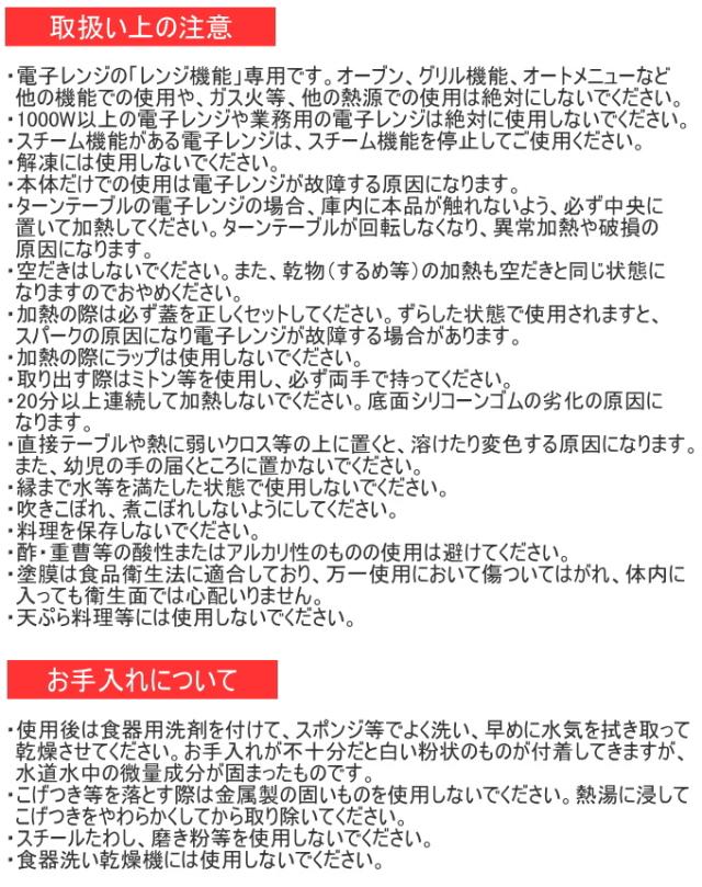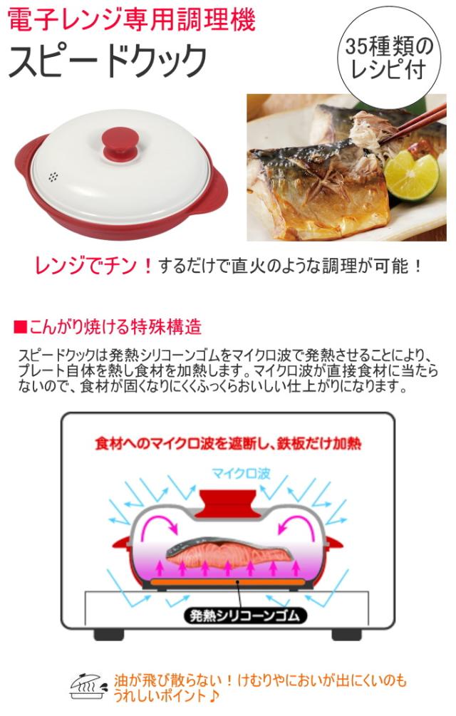 火を使わないから火加減を気にせず気軽に調理! かんたん丸洗い!汚れがサッと落ちてお手入れ簡単! こんがり焼ける特殊構造。 スピードクックは食材へのマイクロ波を遮断し、本体底のプレートがマイクロ波を熱に変換します。 その為、電子レンジでフライパンのような加熱調理ができ、焼き目も付けられます。 油が飛び散らない・けむりやにおいが出にくい! 35種類のレシピ付き。 ※ガス・IHには使用できません。 ■その他の電子レンジ用調理グッズはこちら↓ 電子レンジ用調理グッズ |