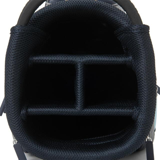 フラッグロゴシリーズのキャディバッグ。高級感のあるシボ合皮を多色使いで組み合わせたデザインが特徴。豊富な収納を備え、小物の整理もしやすい仕様。