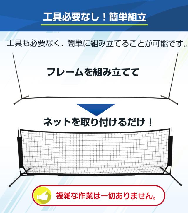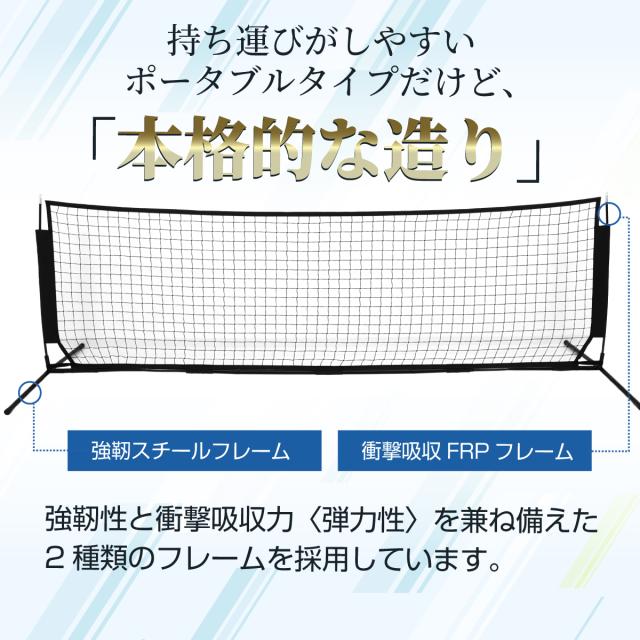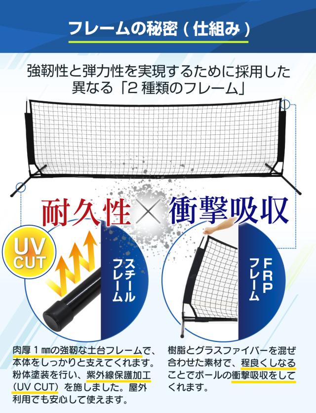 【ポータブルタイプだけど本格的】持ち運びがしやすいポータブルタイプのネットですが、土台はしっかりと支える強靭性に優れた「スチールフレーム」を、ネットには衝撃吸収と弾力性に優れた「FRPフレーム」を採用し、本格的な造りとなっています。
