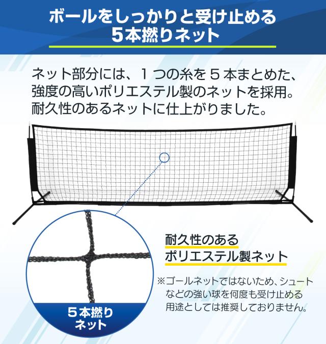 【強度の高いネット】ネット部分は1つの糸を5本にまとめた、強度の高いポリエステル製のネットを採用。耐久性のあるネットに仕上げました。※ゴールネットではないため、強い球を何度も受け止める用途としては推奨しておりません。