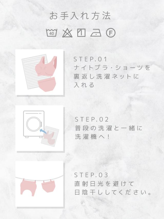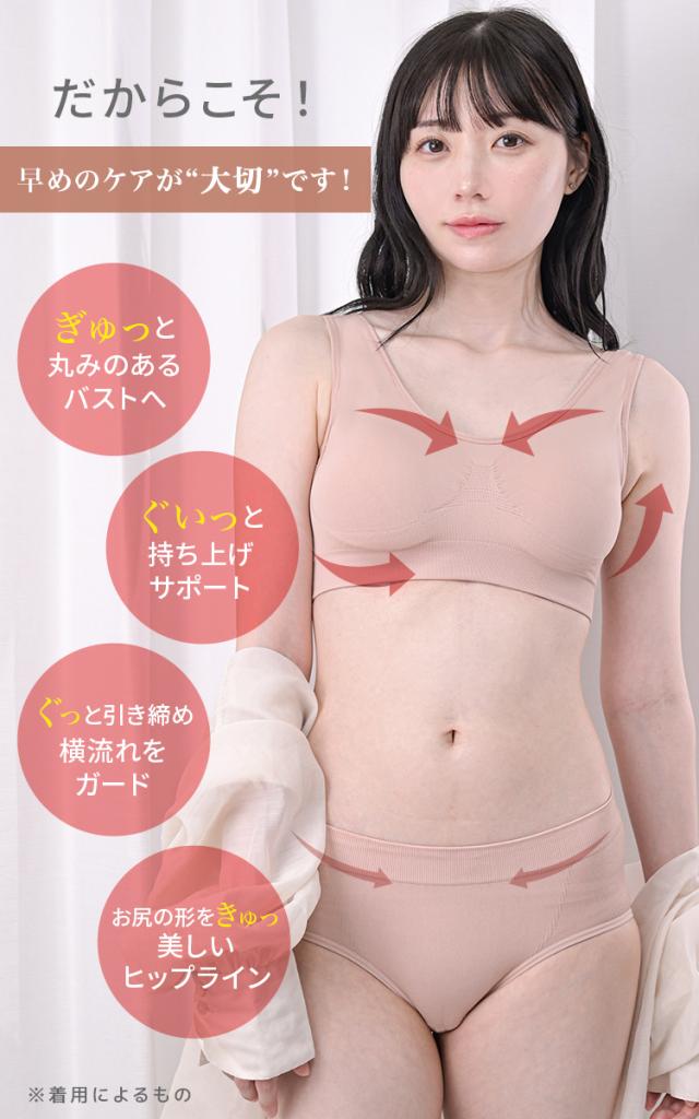 | 素材 | 【ナイトブラ】 本体:ナイロン92%、ポリウレタン8% 脇部分:ポリエステル79%、ナイロン21% 【スタイルアップショーツ】 本体:ナイロン92%、ポリウレタン8% クロッチ:綿100%(グラフェン素材) |